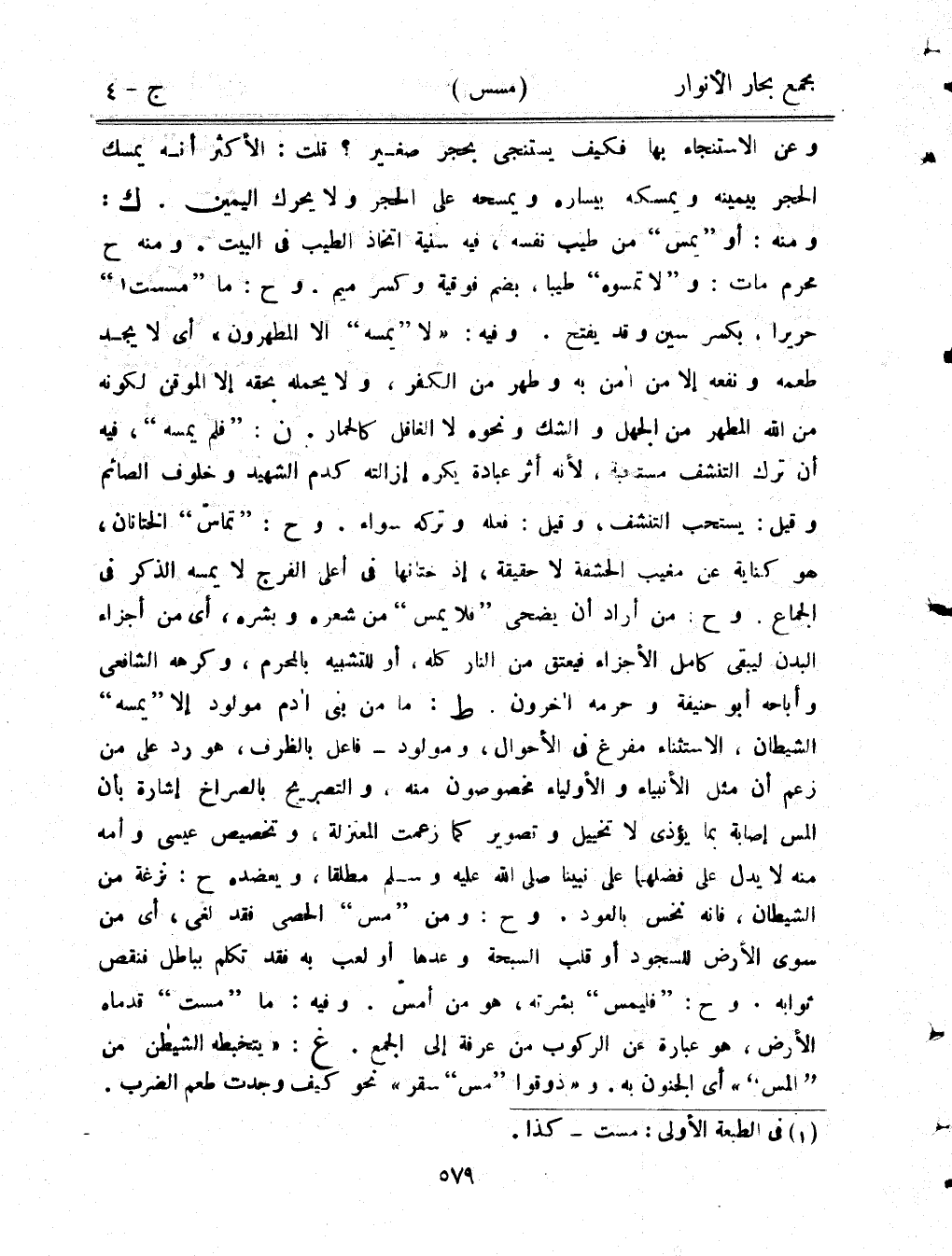 وعن الاستنجاء بها فكيف يستنجي بحجر صغير؟ قلت: الأكثر أنه يمسك الحجر بيمينه ويمسكه بيساره ويمسحه على الحجر ولا يحرك اليمين. ك: ومنه: أو "يمس" من طيب نفسه، فيه سنية اتخاذ الطيب في البيت. ومنه ح محرم مات: و"لا تمسوه" طيبًا، بضم فوقية وكسر ميم. وح: ما "مسست" حريرًا، بكسر سين وقد يفتح. وفيه: "لا "يمسه" إلا المطهرون" أي لا يجد طعمه ونفعه إلا من أمن به وطهر من الكفر، ولا يحمله بحقه إلا الموقن لكونه من الله المطهر من الجهل والشك ونحوه لا الغافل كالحمار. ن: "فلم يمسه"، فيه أن ترك التنشف مستحبة، لأنه أثر عبادة يكره إزالته كدم الشهيد وخلوف الصائم وقيل: يستحب التنشف، وقيل: فعله وتركه سواء. وح: "تماس" الختانان، هو كناية عن مغيب الحشفة لا حقيقة، إذ ختانها في أعلى الفرج لا يمسه الذكر في الجماع. وح: من أراد أن يضحى "فلا يمس" من شعره وبشره، أيم ن أجزاء البدن ليبقى كامل الأجزاء فيعتق من النار كله، أو للتشبيه بالمحرم، وكرهه الشافعي وأباحه أبو حنيفة وحرمه آخرون. ط: ما من بني آدم مولود إلا "يمسه" الشيطان، الاستثناء مفرغ في الأحوال، ومولود- فاعل بالظرف، هو رد على من زعم أن مثل الأنبياء والأولياء مخصوصون منه، والتصريح بالصراخ إشارة بأن المس إصابة بما يؤذي لا تخييل وتصوير كما زعمت المعتزلة، وتخصيص عيسى وأمه منه لا يدل على فضلهما على نبينا صلى الله عليه وسلم مطلقًا، ويعضده ح: نزغة من الشيطان، فإنه نخس بالعود. وح: ومن "مس" الحصى فقد لغى، أي من سوى الأرض للسجود أو قلب السبحة وعدها أو لعب به فقد تكلم بباطل فنقص ثوابه. وح: "فليمس" بشرته، هو من أمس. وفيه: ما "مست" قدماه الأرض، هو عبارة عن الركوب من عرفة إلى الجمع. غ: "يتخبطه الشيطان من "المس"" أي الجنون به. و"ذوقوا "مس" سقر" نحو كيف وجدت طعم الضرب.