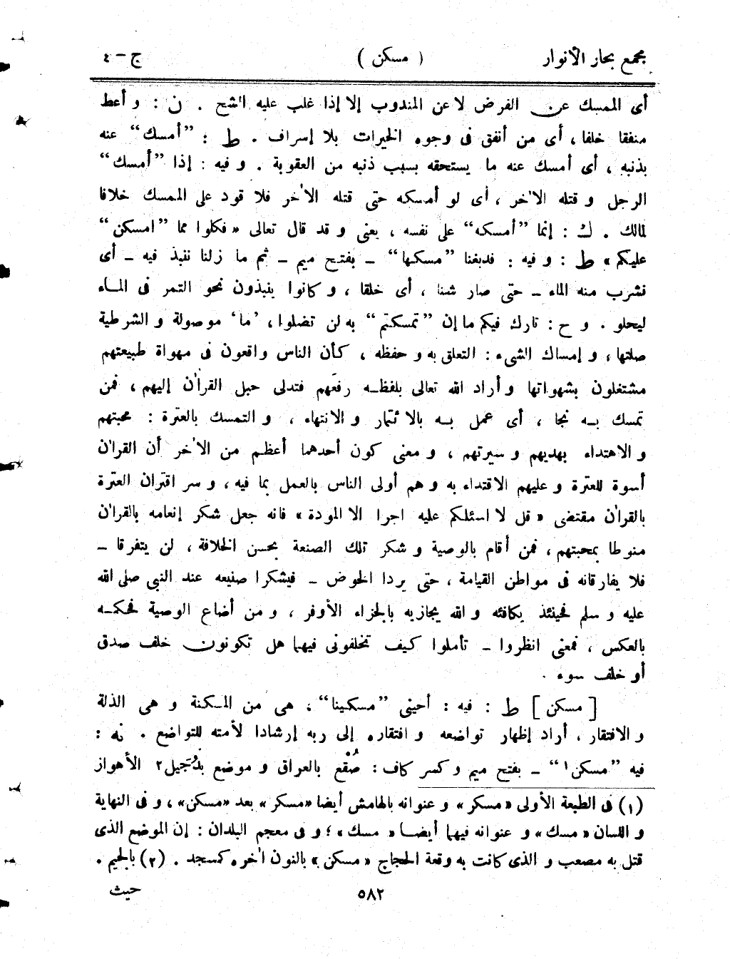 أي الممسك عن الفرض لا عن المندوب إلا إذا غلب عليه الشح. ن: وأعط منفقًا خلفًا، أي من أنفق في وجوه الخيرات بلا إسراف. ط: "أمسك" عنه بذنبه، أي أمسك عنه ما يستحقه بسبب ذنبه من العقوبة. وفيه: إذا "أمسك" الرجل وقتله الآخر، أي لو أمسكه حتى قتله الآخر فلا قود على الممسك خلافًا لمالك. ك: إنما "أمسكه" على نفسه، يعني وقد قال تعالى "فكلوا مما "امسكن" عليكم" ط: وفيه: فدبغنا "مسكها"- بفتح ميم- ثم ما زلنا ننبذ فيه- أي نشرب منه الماء- حتى صار شنا، أي خلقا، وكانوا ينبذون نحو التمر في الماء ليحلو. وح: تارك فيكم ما إن "تمسكتم" به لن تضلوا، "ما" موصولة والشرطية صلتها، وإمساك الشيء: التعلق به وحفظه، كأن الناس واقعون في مهواة طبيعتهم مشتغلون بشهواتها وأراد الله تعالى بلفظه رفعهم فتدلى حبل القرآن إليهم، فمن تمسك به نجا، أي عمل به بالائتمار والانتهاء، والتمسك بالعترة: محبتهم والاهتداء بهديهم وسيرتهم، ومعنى كون أحدهما أعظم من الآخر أن القرآن أسوة للعترة وعليهم الاقتداء به وهم أولى الناس بالعمل بما فيه، وسر اقتران العترة بالقرآن مقتضى "قل لا أسئلكم عليه أجرًا إلا المودة" فإنه جعل شكر إنعامه بالقرآن منوطًا بمحبتهم، فمن أقام بالوصية وشكر تلك الصنعة بحسن الخلافة، لن يتفرقا- فلا يفارقانه في مواطن القيامة، حتى يردا الحوض- فيشكرا صنيعه عند النبي صلى الله عليه وسلم فحينئذ يكافئه والله يجازيه بالجزاء الأوفر، ومن أضاع الوصية فحكمه بالعكس، فمعنى انظروا- تأملوا كيف تخلفوني فيهما هل تكونون خلف صدق أو خلف سوء.