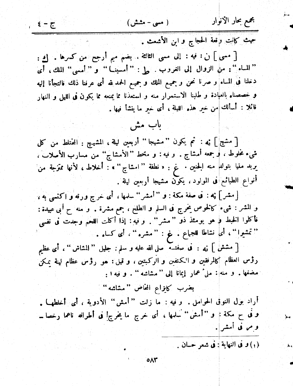 [مسى] ن: فيه: إلى مسى الثالثة، بضم ميم أرجح من كسرها. ك: "المساء": من الزوال إلى الغروب. ط: "أمسينا" و"أمسى" الملك، أي دخلنا في المساء وصرنا نحن وجميع الملك وجميع الحمد لله أي عرفنا ذلك فالتجأنا إليه وخصصناه بالعبادة وطلبنا الاستمرار منه واستعذنا مما يمنعه مما يكون في الليل والنهار قائلًا: أسألك من خير هذه الليلة، أي خير ما ينشأ فيها.