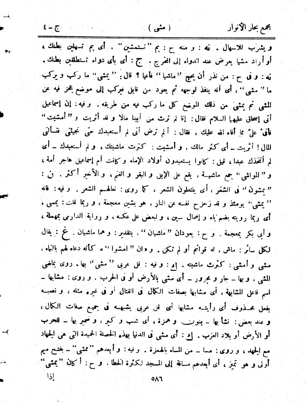 ويشرب للإسهال. نه: ومنه ح: بم "تستمشين"، أي بم تسهلين بطنك، أو أراد مشيًا يعرض عند الدواء إلى المخرج. ج: أي بأي دواء تستطلقين بطنك. نه: وفي ح: من نذر أن يحج "ماشيا" فأعيا؟ قال: "يمشي" ما ركب ويركب ما "مشى"، أي أنه ينفذ لوجهه ثم يعود من قابل فيركب إلى موضع عجز فيه عن المشي ثم يمشي من ذلك الموضع كل ما ركب فيه من طريقه. وفيه: إن إسماعيل أتى إسحاق عليهما السلام فقال: إنا لم نرث من أبينا مالًا وقد أثريت و"أمشيت" فأفئ علي مما أفاء الله عليك، فقال: ألم ترض أني لم أتسعبدك حتى تجيئني فتسألني المال! أثريت- أي كثر مالك، وأمشيت: كثرت ماشيتك، ولم أستعبدك- أي لم أتخذك عبدًا، قيل: كانوا يستعبدون أولاد الإماء وكانت أم إسماعيل هاجر أمة، و"المواشي" جمع ماشية، يقع على الإبل والبقر والغنم، والأخير أكثر. ن: "يمشون" في الشعر، أي ينتعلون الشعر، كما روى: نعالهم الشعر. وفيه: فإنه "يمشي" يومئذ وقد زحزح نفسه عن النار، هو بشين معجمة، وربما قلت: يمسي، أي ربما رويته بضم ياء وإهمال سين، ولبعض على عكسه، ورواية الدارمي بمهملة، وأبي بكر بمعجمة. وح: يعودان "ماشيان"، بتقدير: وهما ماشيان. غ: يقال لكل سائر: ماش، له قوائم أو لم تكن. و"إن "امشوا"" كأنه دعاء لهم بالنماء، مشى وأمشى: كثرت ماشيته. ك: وفيه: قل عربي "مشى" بها، روى بماضي المشي، وبها- جار ومجرور- أي مشى بالأرض أو في الحرب. وروى: مشابها- اسم فاعل المشابهة، أي مشابهًا بصفات الكمال في القتال أو في غيره مثله، ونصبه بفعل محذوف أي رأيته مشابهًا أي قل عربي يشبهه في جميع صفات الكمال، وعند بعض: نشأ بها- بنون وهمزة، أي شب وكبر، وضمير بها- للحرب أو الأرض أو بلاد الغرب. ك: أي مشى في الدنيا بهذه الخصلة الحميدة التي هي الجهاد مع الجهد، وروى: مسا- من المساء بالهمزة. وفيه: وأبعدهم "ممشى"- بفتح ميم أولى وهو تميز، أي أبعدهم مسافة إلى المسجد لكثرة الخطأ. وح: أكان "يمشي"