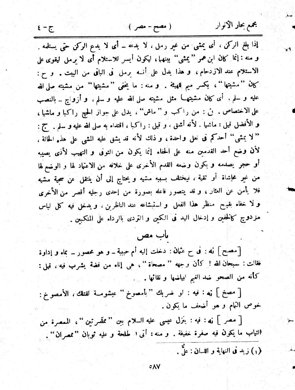 [مصر] نه: فيه: ينزل عيسى عليه السلام بين "ممصرتين"، الممصرة من الثياب ما يكون فيه صفرة خفيفة. ومنه: أتى طلحة وعليه ثوبان "ممصران".