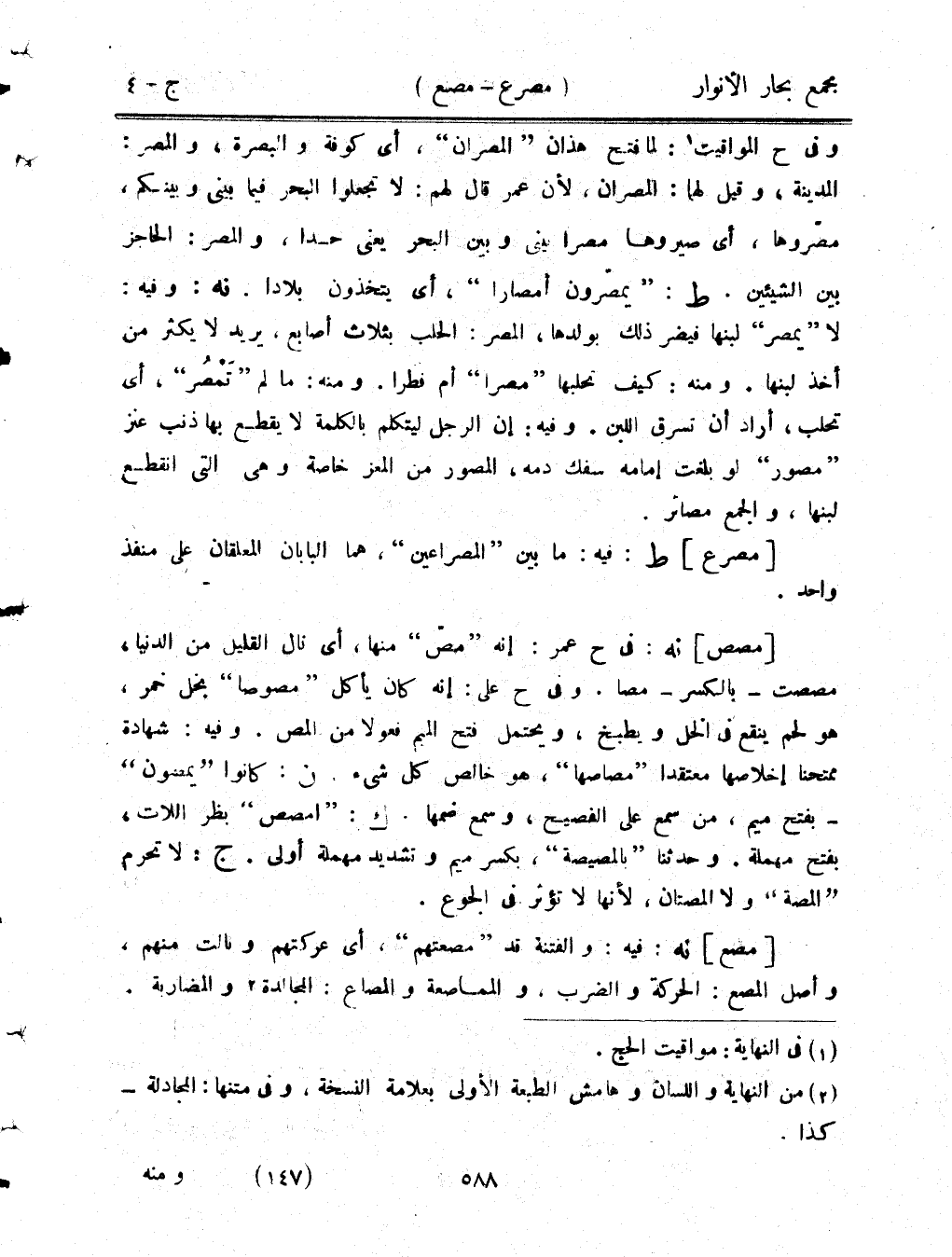 وفي ح المواقيت: لما فتح هذان "المصران"، أي كوفة والبصرة، والمصر: المدينة، وقيل لهما: المصران، لأن عمر قال لهم: لا تجعلوا البحر فيما بيني وبينكم، مصروها، أي صيروها مصرًا بيني وبين البحر يعني حدًا، والمصر: الحاجز بين الشيئين. ط: "يمصرون أمصارًا"، أي يتخذون بلادًا. نه: وفيه: لا "يمصر" لبنها فيضر ذلك بولدها، المصر: الحلب بثلاث أصابع، يريد لا يكثر من أخذ لبنها. ومنه: كيف تحلبها "مصرًا" أم فطرًا. ومنه: ما لم "تمصر"، أي تحلب، أراد أن تسرق اللبن. وفيه: إن الرجل ليتكلم بالكلمة لا يقطع بها ذنب عنز "مصور" لو بلغت إمامه سفك دمه، المصور من المعز خاصة وهي التي انقطع لبنها، والجمع مصائر.