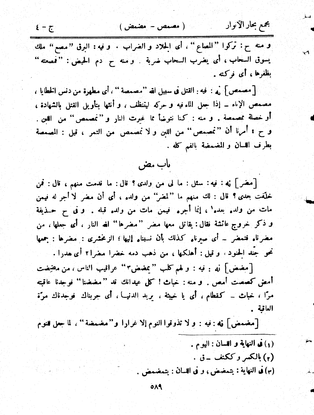 [مضض] نه: فيه: ولهم كلب "يمضض" عراقيب الناس، من مضضت أمض كمصصت أمص. ومنه: خباث! كل عيدانك قد "مضضنا" فوجدنا عاقبته مرًا، خباث- كقطام، أي يا خبيثة، يريد الدنيا، أي جربناك فوجدناك مرة العاقبة.