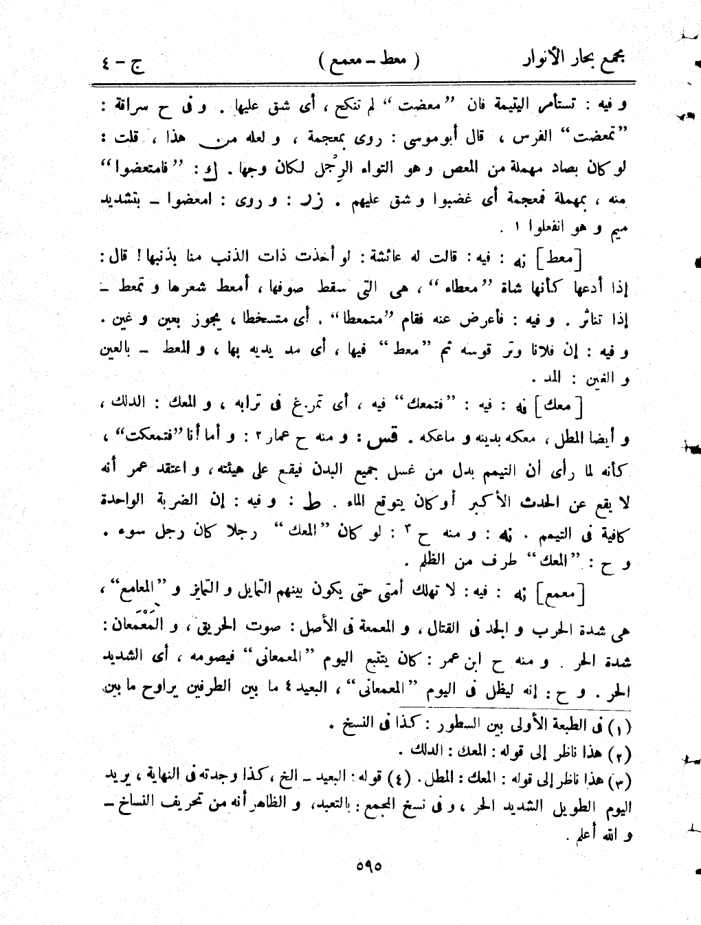 [معك] نه: فيه: "فتمعك" فيه، أي تمرغ في ترابه، والمعك: الدلك، وأيضًا المطل، معكه بدينه وماعكه. قس: ومنه ح عمار: وأما أنا "فتمعكت"، كأنه لما رأى أن التيمم بدل من غسل جميع البدن فيقع على هيئته، واعتقد عمر أنه لا يقع عن الحدث الأكبر أو كان يتوقع الماء. ط: وفيه: إن الضربة الواحدة كافية في التيمم. نه: ومنه ح: لو كان "المعك" رجلًا كان رجل سوء. وح: "المعك" طرف من الظلم.