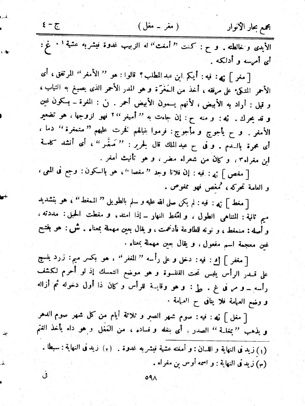 [مغر] نه: فيه: أيكم ابن عبد المطلب؟ قالوا: هو "الأمغر" المرتفق، أي الأحمر المتكئ على مرفقه، اخذ من المغرة وهو المدر الأحمر الذي يصبغ به الثياب، وقيل: أراد به الأبيض، لأنهم يسمون الأبيض أحمر. ن: المغرة- بسكون غين وقد يحرك. نه: ومنه ح: إن جاءت به "أميغر" فهو لزوجها، هو تضعير الأمغر. وح يأجوج ومأجوج: فرموا بنبالهم فخرت عليهم "متمغرة" دمًا، أي محمرة بالدم. وفي ح عبد الملك قال لجرير: "مغر"، أي أنشد كلمة ابن مغراء، وكان من شعراء مضر، وهو تأنيث أمغر.