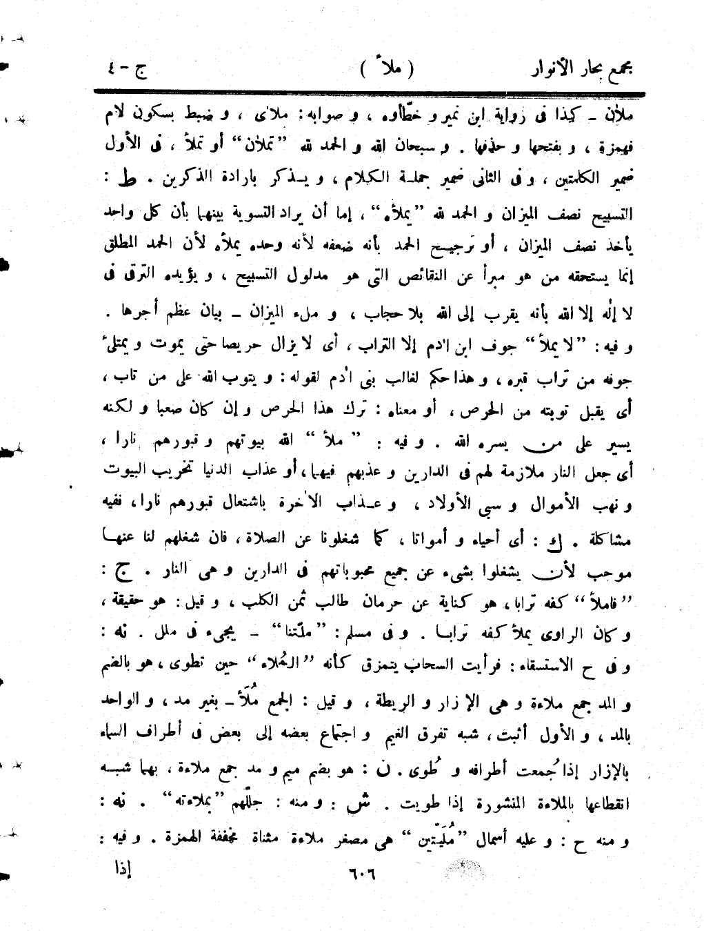 ملأن- كذا في رواية ابن نمير خطأوه، وصوابه: ملأى، وضبط بسكون لام فهمزة، وبفتحها وحذفها. وسبحان الله والحمد لله "تملأن" أو تملأ، في الأول ضمير الكلمتين، وفي الثاني ضمير جملة الكلام، ويذكر بإرادة الذكرين. ط: التسبيح نصف الميزان والحمد لله "يملأه"، إما أن يراد التسوية بينهما بأن كل واحد يأخذ نصف الميزان، أو ترجيح الحمد بأنه ضعفه لأنه وحده يملأه لأن الحمد المطلق إنما يستحقه من هو مبرأ عن النقائص التي هو مدلول التسبيح، ويؤيده الترقي في لا إله إلا الله بأنه يقرب إلى الله بلا حجاب، وملء الميزان- بيان عظم أجرها. وفيه: "لا يملأ" جوف ابن آدم إلا التراب، أي لا يزال حريصًا حتى يموت ويمتلئ جوفه من تراب قبره، وهذا حكم لغالب بني آدم لقوله: ويتوب الله على من تاب، أي يقبل توبته من الحرص، أو معناه: ترك هذا الحرص وإن كان صعبًا ولكنه يسير على من يسره الله. وفيه: "ملأ" الله بيوتهم وقبورهم نارًا، أي جعل النار ملازمة لهم في الدارين وعذبهم فيهما، أو عذاب الدنيا تخريب البيوت ونهب الأموال وسبي الأولاد، وعذاب الآخرة باشتعال قبورهم نارًا، ففيه مشاكلة. ك: أي أحياء وأمواتًا، كما شغلونا عن الصلاة، فإن شغلهملنا عنها موجب لأن يشغلوا بشيء عن جميع محبوباتهم في الدارين وهي النار. ج: "فاملأ" كفه ترابًا، هو كناية عن حرمان طالب ثمن الكلب، وقيل: هو حقيقة، وكان الراوي يملأ كفه ترابًا. وفي مسلم: "ملتنا"- يجيء في ملل. نه: وفي ح الاستسقاء: فرأيت السحاب يتمزق كأنه "الملاء" حين تطوى، هو بالضم والمد جمع ملاءة، وهي الإزار والريطة، وقيل: الجمع ملأ- بغير مد، والواحد بالمد، والأول أثبت، شبه تفرق الغيم واجتماع بعضه إلى بعض في أطراف السماء بالإزار إذا جمعت أطرافه وطوى. ن: هو بضم ميم ومد جمع ملاءة، بهما شبه انقطاعها بالملاءة المنشورة إذا طويت. ش: ومنه: جللهم "بملاءته". نه: ومنه ح: وعليه أسمال "مليتين" هي مصغر ملاءة مثناة مخففة الهمزة. وفيه: