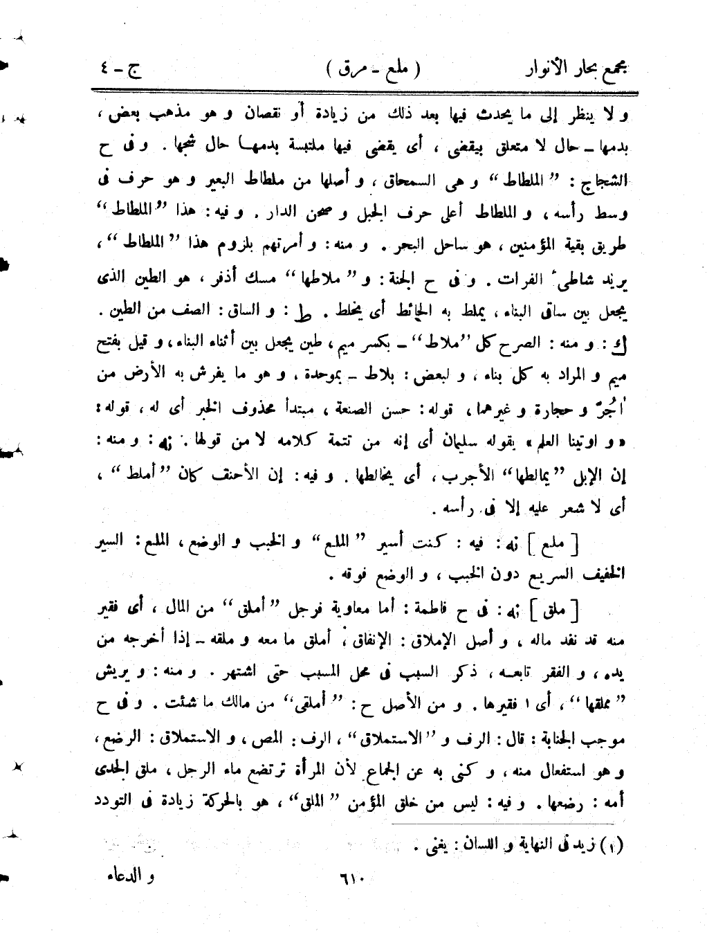 ولا ينظر إلى ما يحدث فيها بعد ذلك من زيادة أو نقصان وهو مذهب بعض، بدمها- حال لا متعلق بيقضي، أي يقضي فيها ملتبسة بدمها حال شجها. وفي ح الشجاج: "الملطاط" وهي السمحاق، وأصلها من ملطاط البعير وهو حرف في وسط رأسه، والملطاط أعلى حرف الجبل وصحن الدار. وفيه: هذا "الملطاط" طريق بقية المؤمنين، هو ساحل البحر. ومنه: وأمرتهم بلزوم هذا "الملطاط"، يريد شاطئ الفرات. وفي ح الجنة: و"ملاطها" مسك أذفر، هو الطين الذي يجعل بين ساقي البناء، يملط به الحائط أي يخلط. ط: والساق: الصف من الطين. ك: ومنه: الصرح كل "ملاط"- بكسر ميم، طين يجعل بين أثناء البناء، وقيل بفتح ميم والمراد به كل بناء، ولبعض: بلاط- بموحدة، وهو ما يفرش به الأرض من أجر وحجارة وغيرهما، قوله: حسن الصنعة، مبتدأ محذوف الخبر أي له، قوله: "وأوتينا العلم" يقوله سليمان أي إنه من تتمة كلامه لا من قولها. نه: ومنه: إن الإبل "يمالطها" الأجرب، أي يخالطها. وفيه: إن الأحنف كان "أملط"، أي لا شعر عليه إلا في رأسه.
