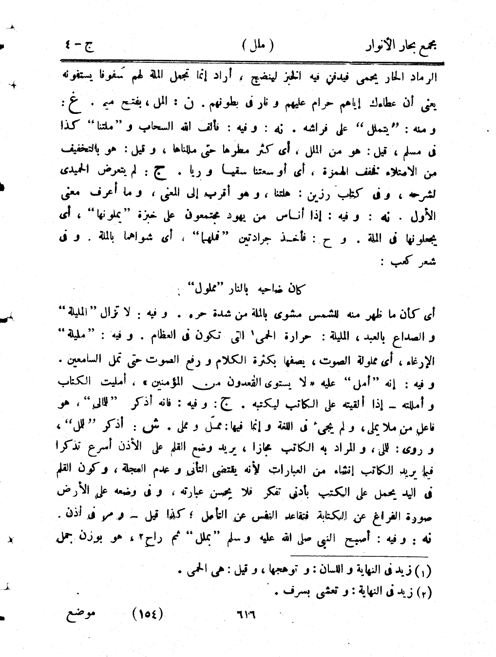الرماد الحار يحمي فيدفن فيه الخبز لينضج، أراد إنما تجعل الملة لهم سفوفًا يستفونه يعني أن عطاءك إياهم حرام عليهم ونار في بطونهم. ن: المل، بفتح ميم. غ: ومنه: "يتملل" على فراشه. نه: وفيه: فألف الله السحاب و"ملتنا" كذا في مسلم، قيل: هو من الملل، أي كثر مطرها حتى مللناها، وقيل: هو بالتخفيف من الامتلاء فخفف الهمزة، أي أوسعتنا سقيًا وريا. ج: لم يتعرض الحميدي لشرحه، وفي كتاب رزين: هلتنا، وهو أقرب إلى المعنى، وما أعرف معنى الأول. نه: وفيه: إذا أناس من يهود مجتمعون على خبزة "يملونها"، أي يجعلونها في الملة. وح: فأخذ جرادتين "فملهما"، أي شواهما بالملة. وفي شعر كعب: