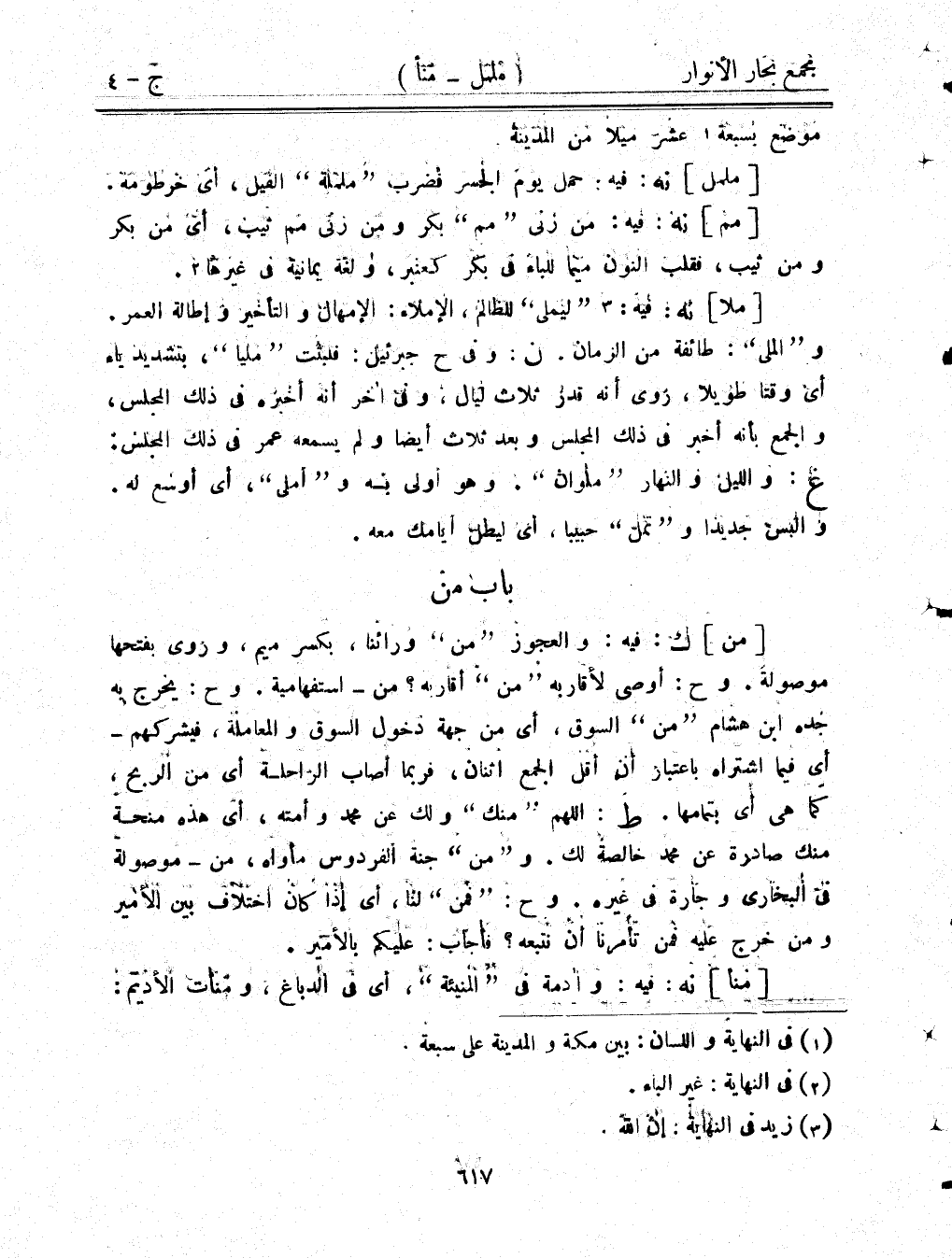 [من] ك: فيه: والعجوز "من" ورائنا، بكسر ميم، وروى بفتحها موصولة. وح: أوصى لأقاربه "من" أقاربه؟ من- استفهامية. وح: يخرج به جده ابن هشام "من" السوق، أي من جهة دخول السوق والمعاملة، فيشركهم- أي فيما اشتراه باعتبار أن أقل الجمع اثنان، فربما أصاب الراحلة أي من الربح، كما هي أي بتمامها. ط: اللهم "منك" ولك عن محمد وأمته، أي هذه منحة منك صادرة عن محمد خالصة لك. و"من" جنة الفردوس مأواه، من- موصولة في البخاري وجارة في غيره. وح: "فمن" لنا، أي إذا كان اختلاف بين الأمير ومن خنرج عليه فمن تأمرنا أن نتبعه؟ فأجاب: عليكم بالأمير.