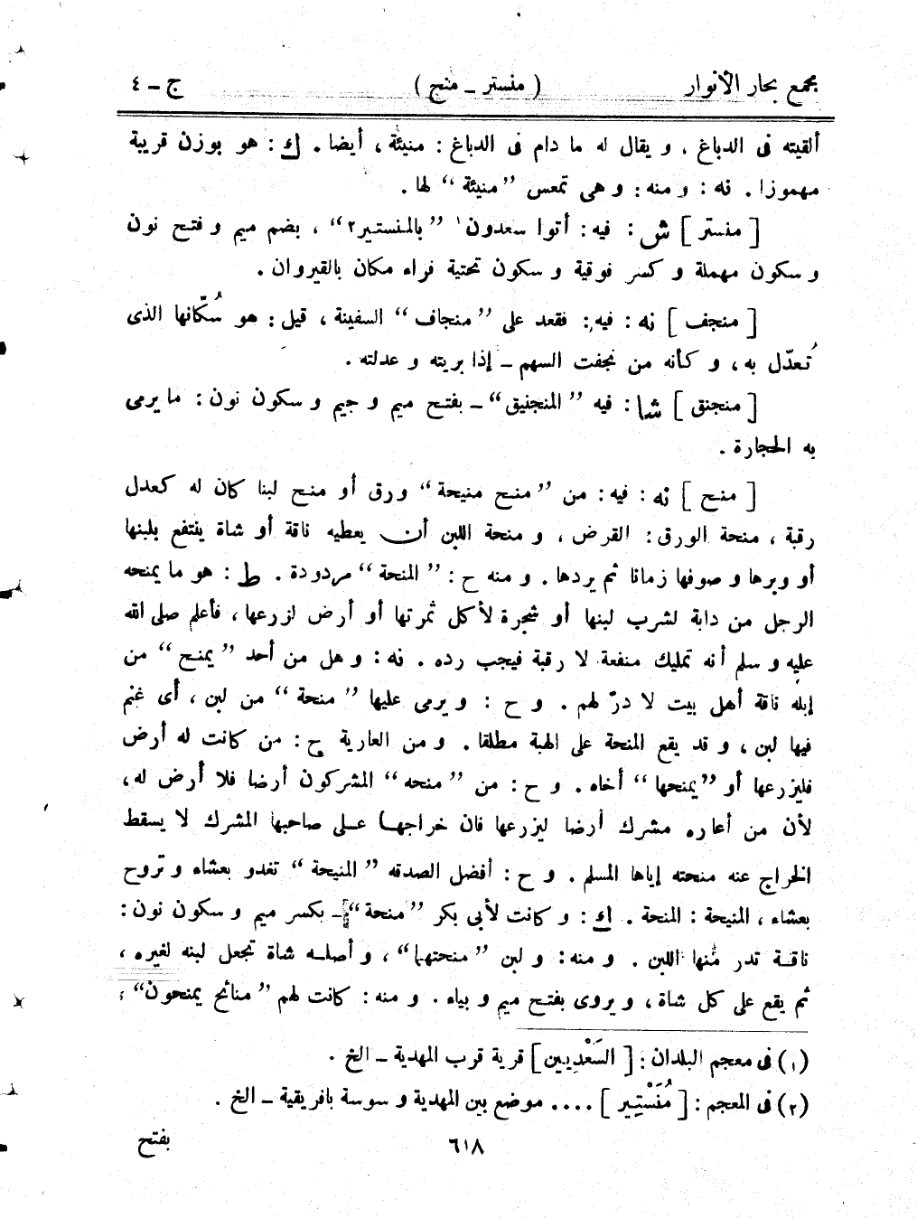 [منح] نه: فيه: من "منح منيحة" ورق أو منح لبنا كان له كعدل رقبة، منحة الورق: القرض، ومنحة اللبن أن يعطيه ناقة أو شاة ينتفع بلبنها أو وبرها وصوفها زمانًا ثم يردها. ومنه ح: "المنحة" مردودة. ط: هو ما يمنحه الرجل من دابة لشرب لبنها أو شجرة لأكل ثمرتها أو أرض لزرعها، فأعلم صلى الله عليه وسلم أنه تمليك منفعة لا رقبة فيجب رده. نه: وهل من أحد "يمنح" من غبله ناقة أهل بيت لا در لهم. وح: ويرمي عليها "منحة" من لبن، أي غنم فيها لبن، وقد يقع المنحة على الهبة مطلقًا. ومن العارية ج: من كانت له أرض فليزرعها أو "يمنحها" أخاه. وح: من "منحه" المشركون أرضًا فلا أرض له، لأن من أعاره مشرك أرضًا ليزرعها فإن خراجها على صاحبها المشرك لا يسقط الخراج عنه منحته إياها المسلم. وح: أفضل الصدقة "المنيحة" تغدو بعشاء وتروح بعشاء، المنيحة: المنحة. ك: وكانت لأبي بكر "منحة"- بكسر ميم وسكون نون: ناقة تدر منها اللبن. ومنه: ولبن "منحتهما"، وأصله شاة تجعل لبنه لغيره، ثم يقع على كل شاة، ويروى بفتح ميم وبياء. ومنه: كانت لهم "منائح يمنحون"،