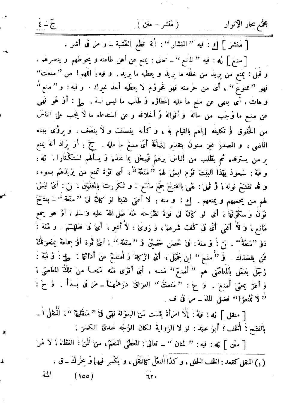 [منع] نه: فيه "المانع"- تعالى: يمنع عن أهل طاعته ويحوطهم وينصرهم، وقيل: ينمع من يريد من خلقه ما يريد ويعطيه ما يريد. وفيه: اللهم! من "منعت" فهو "ممنوع"، أي من حرمته فهو محروم لا يعطيه أحد غيرك. وفيه: و"منع" وهات، أي ينهي عن منع ما عليه إعطاؤه وطلب ما ليس له. ط: أو هو نهى عن منع ما وجب من ماله وأقواله وأخلاقه وعن استدعاء ما لا يجب على الناس من الحقوق وتكليفه إياهم بالقيام به، وكأنه ينتصف ولا ينصف، ويروى ببناء الماضي، والمصدر غير منون بتقدير إضافة أي منع ما عليه. ج: أو يراد أنه يمنع بر من يسترفده ثم يطلب من الناس برهم فيبخل بما عنده ويسألهم استكثارًا. نه: وفيه: سيعوذ بهذا البيت قوم ليس لهم "منعة"، أي قوة تمنع من يريدهم بسوء، وقد تفتح نونه، وقيل: هي بالفتح جمع مانع- وتكررت بالمعنيين. ن: أي ليس لهم من يميهم ويمنعهم. ك: ومنه: لا أعني شيئًا لو كان لي "منعة"- بفتح نون وسكونها، أي لو كان لي قوة لطرحته عنه صلى الله عليه وسلم، أو هو جمع مانع، ولا أعني أي في كفت شرهم، وروى: لا أعير، أي في فعلهم. ومنه: ذو "منعة". ن: ومنه: في حصن حصين و"منعة"، أي قوة او جماعة يمنعونك ممن يقصدك. و"منع" ابن جميل، أي الزكاة وامتنع عن أذانها. ط: وفيه: رجل يعمل بالمعاصي هم "أمنع" منه، أي أقوى منه منعًا من تلك المعاصي، وأعز بمعنى أمنع. وح: "منعت" العراق درهمها- مر في بدأ. وح: "لا تمنعوا" فضل الماء- مر في ف.