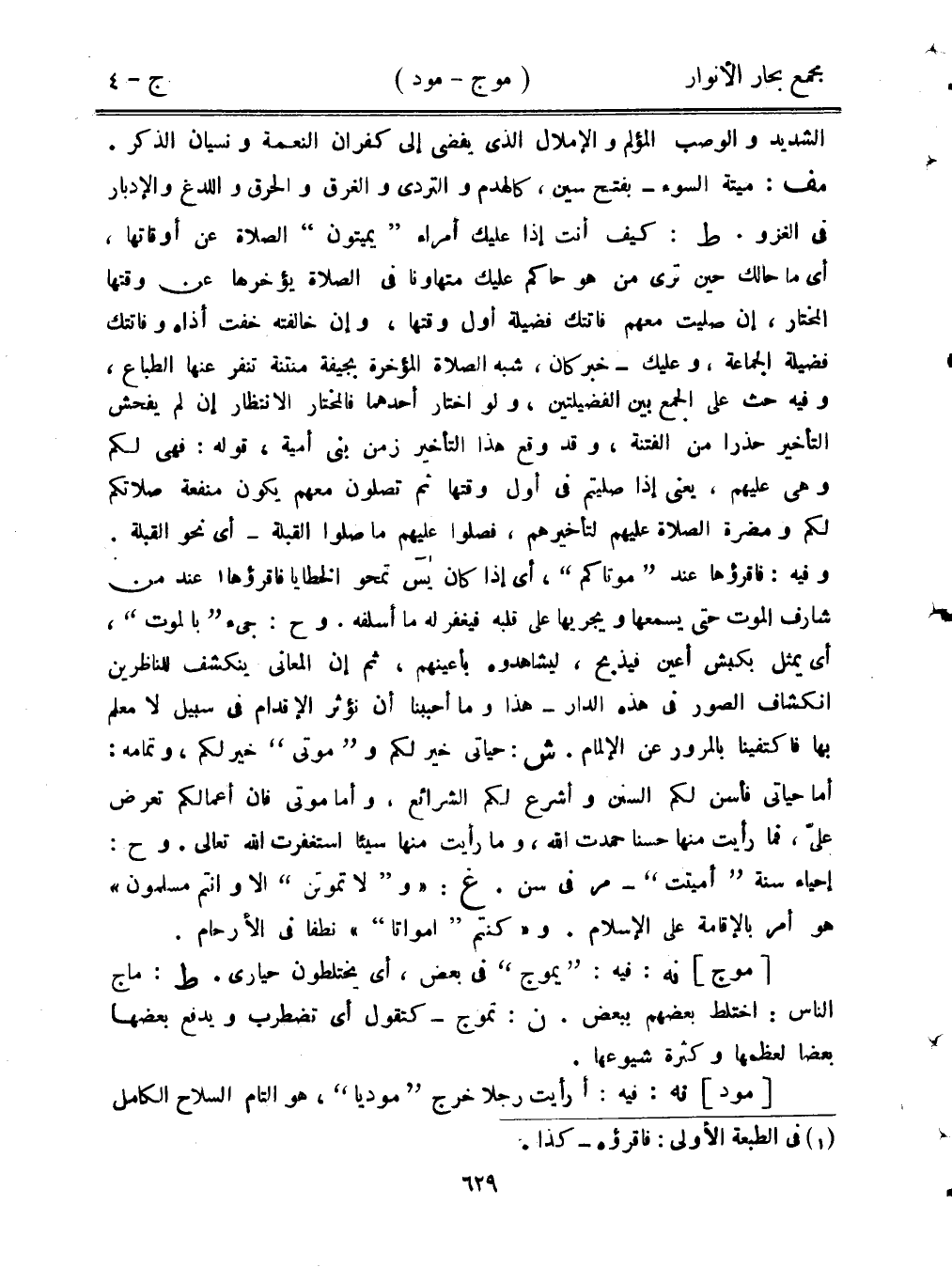 الشديد والوصب المؤلم والإملال الذي يفضي إلى كفران النعمة ونسيان الذكر. مف: ميتة السوء- بفتح سين، كالهدم والتردي والغرق والحرق واللدغ والإدبار في الغزو. ط: كيف أنت إذا عليك أمراء "يميتون" الصلاة عن أوقاتها، أي ما حالك حين ترى من هو حاكم عليك متهاونًا في الصلاة يؤخرها عن وقتها المختار، إن صليت معهم فأتتك فضيلة أول وقتها، وإن خالفته خفت أذاه وفاتتك فضيلة الجماعة، وعليك- خبر كان، شبه الصلاة المؤخرة بجيفة منتنة تنفر عنها الطباع، وفيه حث على الجمع بين الفضيلتين، ولو اختار أحدهما فالمختار الانتظار إن لم يفحش التأخير حذرًا من الفتنة، وقد وقع هذا التأخير زمن بني أمية، قوله: فهي لكم وهي عليهم، يعني إذا صليتم في أول وقتها ثم تصلون معهم يكون منفعة صلاتكم لكم ومضرة الصلاة عليهم لتأخيرهم، فصلوا عليهم ما صلوا القبلة- أي نحو القبلة. وفيه: فاقرؤها عند "موتاكم"، أي إذا كان يس تمحو الخطايا فاقرؤها عند من شارف الموت حتى يسمعها ويجريها على قلبه فيغفر له ما أسلفه. وح: جيء "بالموت"، أي يمثل بكبش أعين فيذبح، ليشاهدوه بأعينهم، ثم إن المعاني ينكشف للناظرين انكشاف الصور في هذه الدار- هذا وما أحببنا أن نؤثر الإقدام في سبيل لا معلم بها فاكتفينا بالمرور عن الإلمام. ش: حياتي خير لكم و"موتى" خير لكم، وتمامه: أما حياتي فأسن لكم السنن وأشرع لكم الشرائع، وأما موتى فإن أعمالكم تعرض علي، فما رأيت منها حسنًا حمدت الله، وما رأيت منها سيئًا استغفرت الهل تعالى. وح: إحياء سنة "أميتت"- مر في سن. غ: "و "لا تموتن" إلا وأنتم مسلمون" هو أمر بالإقامة على الإسلام. و"كنتم "أموتًا"" نطفًا في الأرحام.