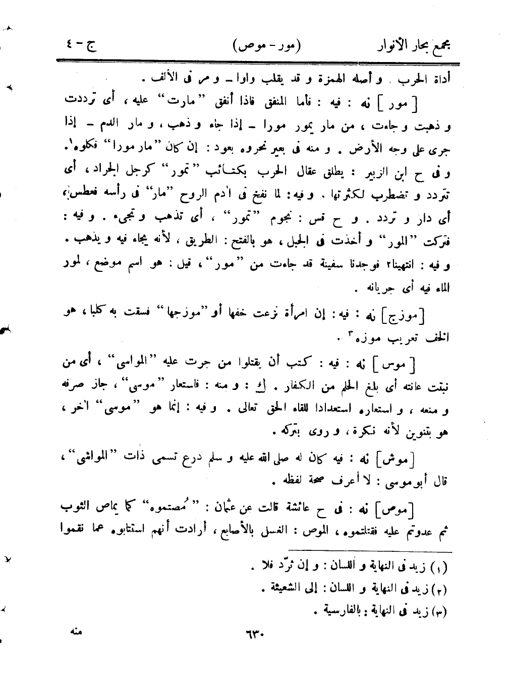 [موس] نه: فيه: كتب أن يقتلوا من جرت عليه "المواسي"، أي من نبتت عانته أي بلغ الحلم من الكفار. ك: ومنه: فاستعار "موسى"، جاز صرفه ومنعه، واستعاره استعدادًا للقاء الحق تعالى. وفيه: إنما هو "موسى" آخر، هو بتنوين لأنه نكرة، وروى بتركه.
