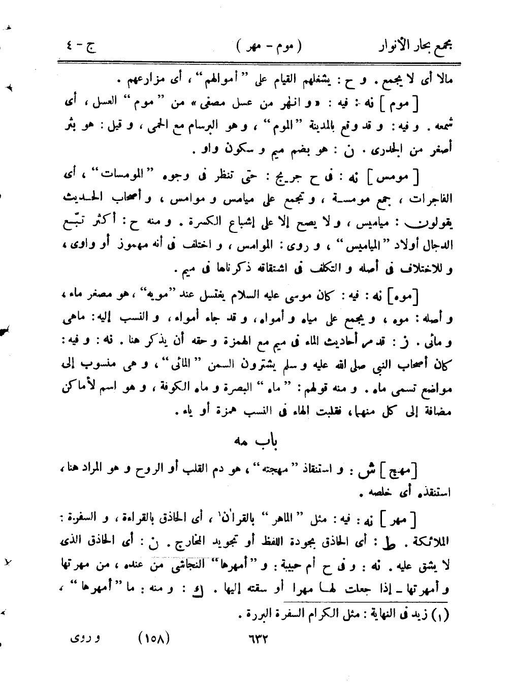[موه] نه: فيه: كان موسى عليه السلام يغتسل عند "مويه"، هو مصغر ماء، وأصله: موه، ويجمع على مياه وأمواه، وقد جاء أمواء، والنسب إليه: ما هي ومائي. ز: قد مر أحاديث الماء في ميم مع الهمزة وحقه أن يذكر هنا. نه: وفيه: كان أصحاب النبي صلى الله عليه وسلم يشترون السمن "المائي"، وهي منسوب إلى مواضع تسمى ماه. ومنه قولهم: "ماه" البصرة وماه الكوفة، وهو اسم لأماكن مضافة إلى كل منهما، فقلبت الهاء في النسب همزة أو ياء.