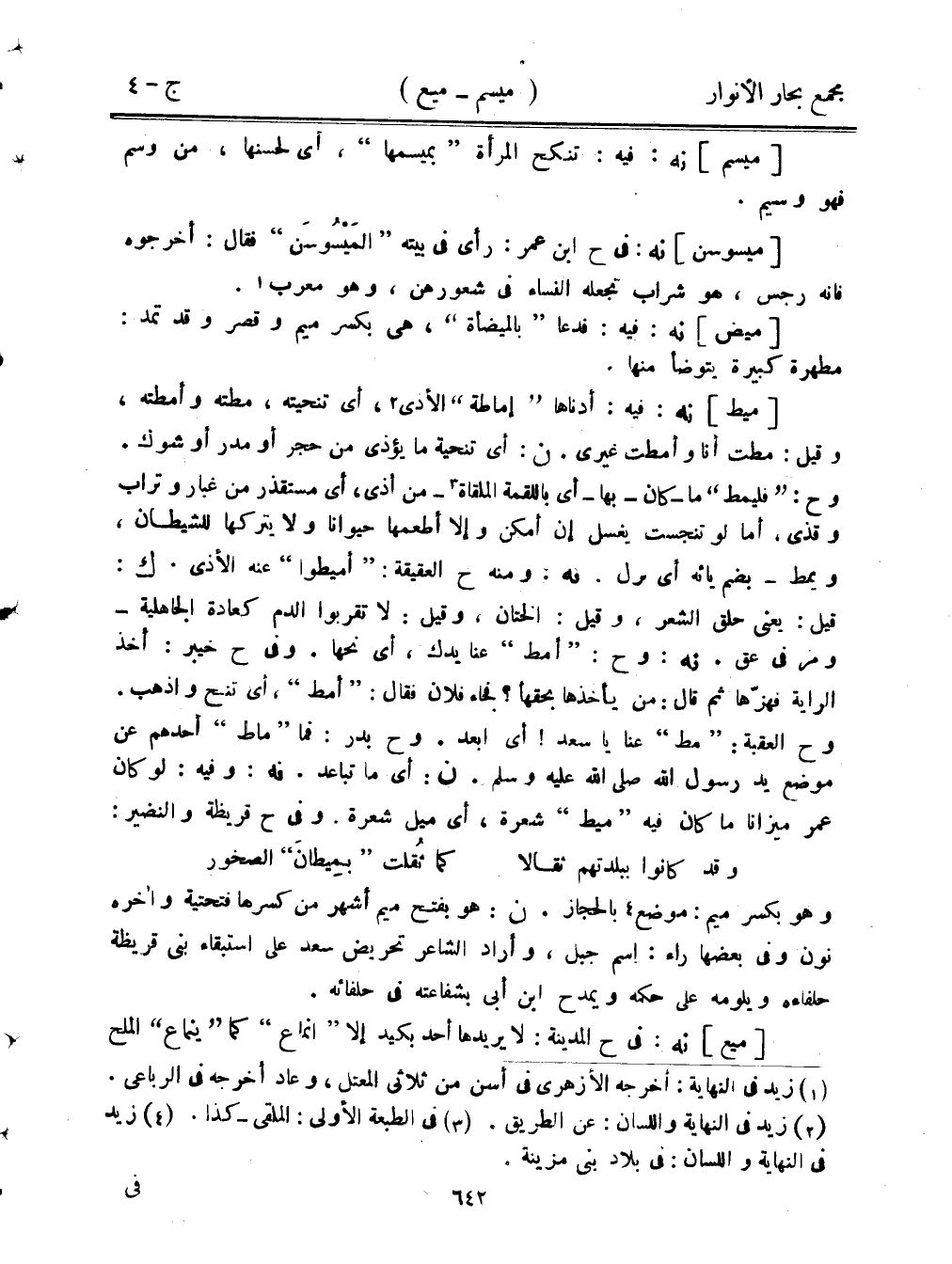 [ميط] نه: فيه: أدناها "إماطة" الأذى، أي تنحيته، مطته وأمطته، وقيل: مطت أنا وأمطت غيريز ن: أي تنحية ما يؤذي من حجر أو مدر أو شوك. وح: "فليمط" ما- كان- بها- أي باللقمة الملقاة- من أذى، أي مستقذر من غبار وتراب وقذى، أما لو تنجست يغسل إن أمكن وإلا أطعمها حيوانًا ولا يتركها للشيطان، ويمط- بضم يائه أي نزل. نه: ومنه ح العقيقة: "أميطوا" عنه الأذى. ك: قيل: يعني حلق الشعر، وقيل: الختان، وقيل: لا تقربوا الدم كعادة الجاهلية- ومر في عق. نه: وح: "أمط" عنا يدك، أي نحها. وفي ح خيبر: أخذ الراية فهزها ثم قال: من يأخذها بحقها؟ فجاء فلان فقال: "أمط"، أي تنح واذهب. وح العقبة: "مط" عنا يا سعد! أي ابعد. وح بدر: فما "ماط" أحدهم عن موضع يد رسول الله صلى الله عليه وسلم. ن: أي ما تباعد. نه: وفيه: لو كان مر ميزانا ما كان فيه "ميط" شعرة، أي ميل شعرة. وفي ح قريظة والنضير: