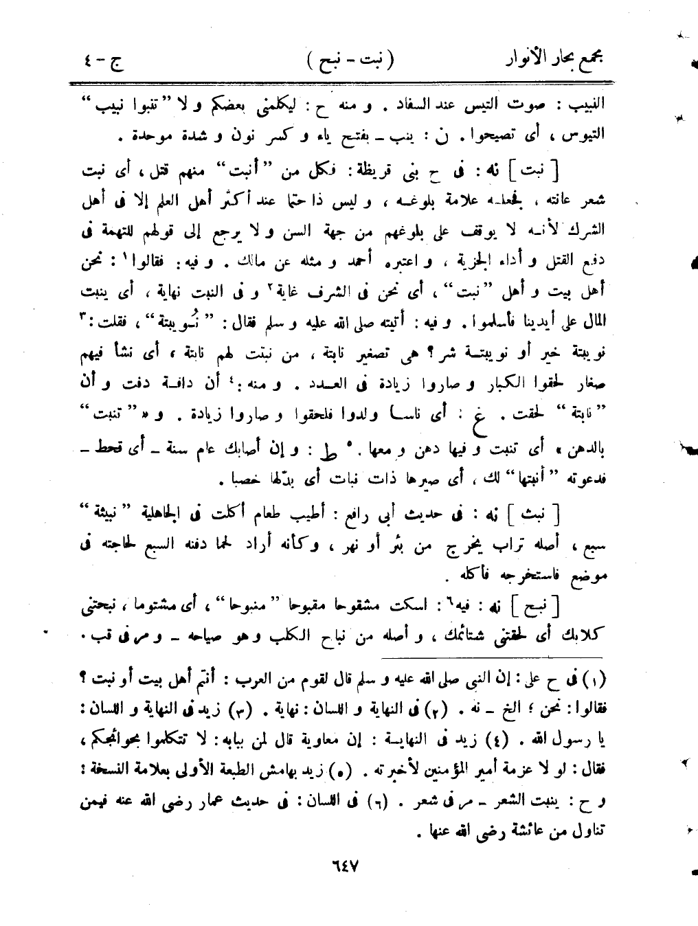 [نبت] نه: في ح بني قريظة: فكل من "أنبت" منهم قتل، أي نبت شعر عانته، فجعله علامة بلوغه، وليس ذا حتمًا عند أكثر أهل العلم إلا في أهل الشرك لأنه لا يوقف على بلوغهم من جهة السن ولا يرجع إلى قولهم للتهمة في دفع القتل وأداء الجزية، واعتبره أحمد ومثله عن مالك. وفيه: فقالوا: نحن أهل بيت وأهل "نبت"، أي نحن في الشرف غاية وفي النبت نهاية، أي ينبت المال على أيدينا فأسلموا. وفيه: أتيته صلى الله عليه وسلم فقال: "نويبتة"، فقلت: نويبتة خير أو نويبتة شر؟ هي تصغير نابتة، من نبتت لهم نابتة، أي نشأ فيهم صغار لحقوا الكبار وصاروا زيادة في العدد. ومنه: أن دافة دفت وأن "نابتة" لحقت. غ: أي ناسا ولدوا فلحقوا وصاروا زيادة. و""تنبت" بالدهن" أي تنبت وفيها دهن ومعها. ط: وإن أصابك عام سنة- أي قحط- فدعوته "أنبتها" لك، أي صيرها ذات نبات أي بدلها خصبًا.