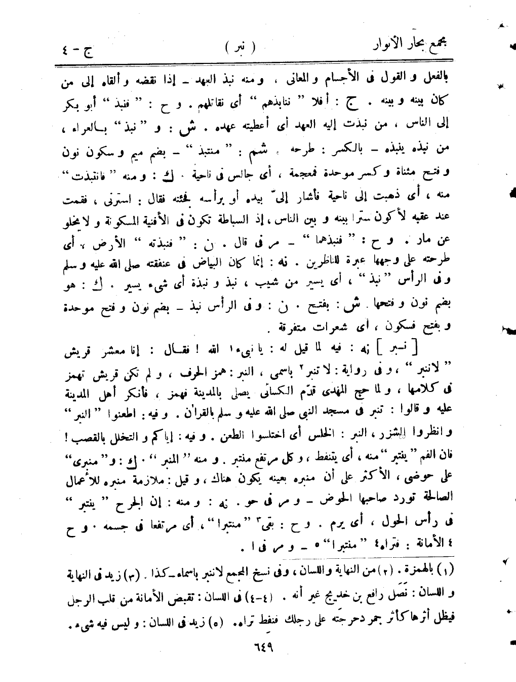 [نبر] نه: فيه لما قيل له: يا نبئ الله! فقال: إنا معشر قريش "لا ننبر"، وفي رواية: لا تنبر باسمي، النبر: همز الحرف، ولم تكن قريش تهمز في كلامها، ولما حج المهدي قدم الكسائي يصلي بالمدينة فهمز، فأنكر أهل المدينة عليه وقالوا: تنبر في مسجد النبي صلى الله عليه وسلم بالقرآن. وفيه: اطعنوا "النبر" واظروا الشزر، النبر: الخلس أي اختلسوا الطعن. وفيه: إياكم والتخلل بالقصب! فإن الفم "ينتبر" منه، أي يتنفط، وكل مرتفع منتبر. ومنه "المنبر". ك: و"منبري" على حوضي، الأكثر على أن منبره بعينه يكون هناك، وقيل: ملازمة منبره للأعمال الصالحة تورد صاحبها الحوض- ومر في حو. نه: ومنه: إن الجرح "ينتبر" في رأس الحول، أي يرم. وح: بقي "منتبرًا"، أي مرتفعًا في جسمه. وح الأمانة: فتراه "منتبرًا"- ومر في أ.