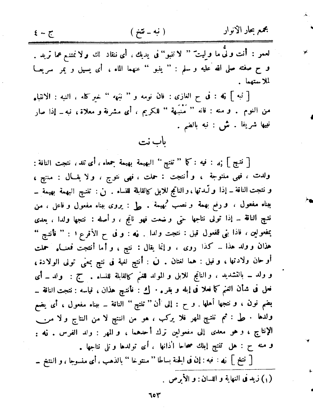 [نتج] نه: فيه: كما "تنتج" البهيمة بهيمة جمعاء، أي تلد، نتجت الناقة: ولدت، فهي منتوجة، وأنتجت: حملت، فهي نتوج، ولا يقال: منتج، ونتجت الناقة- إذا ولدتها، والناتج للإبل كالقابلة للنساء. ن: تنتج البهمة بهيمة- ببناء مفعول، ورفع بهمة ونصب بهيمة. ط: يروى ببناء مفعول وفاعل، من نتج الناقة- إذا تولى نتاجها حتى وضعت فهو ناتج، وأصله: نتجها ولدًا، يعدى بمفعولين، فإذا بني للمفعول قيل: نتجت ولدًا. نه: وفي ح الأقرع: "فأنتج" هذان وولد هذا- كذا روى، وإنما يقال: نتج، وأما أنتجت فمعناه حملت أو حان ولادتها، وقيل: هما لغتان. ن: أنتج لغية في نتج بمعنى تولى الولادة، وولد- بالتشديد، والناتج للإبل والمولد للغنم كالقابلة للنساء. ج: ولد- أي فعل في شأن الغنم كما فعلا في إبله وبقره. ك: فأنتج هذان، قياسه: نتجت الناقة- بضم نون، ونتجها أهلها. وح: إلى أن "تنتج" الناقة- ببناء مفعول، أي يضع ولدها. ط: ثم تنتج المهر فلا يركب، هو من النتج لا من النتاج ولا من الإنتاج، وهو معدي إلى مفعولين ترك أحدهما، والمهر: ولد الفرس. نه: ومنه ح: هل تنتج إبلك صحاحًا أذانها، أي تولدها وتلي نتاجها.