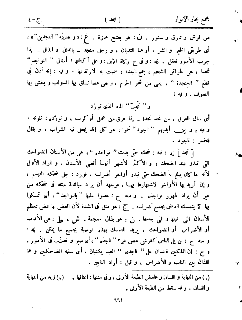 [نجذ] نه: فيه: ضحك حتى بدت "نواجذه"، هي من الأسنان الضواحك التي تبدو عند الضحك، والأكثر الأشهر أنها أقصى الأسنان، والمراد الأول لأنه ما كان يبلغ به الضحك حتى تبدو أواخر أضراسه، فورد: جل ضحكه التبسم، وإن أريد بها الأواخر لاشتهارها بها، فوجهه أن يراد مبالغة مثله في ضحكه من غير أن يراد ظهور نواجذه. ومنه ح: عضوا عليها "بالنواجذ"، أي تمسكوا بها كما يتمسك العاض بجميع أضراسه. ج: هو مثل في الشدة لأن العض بها عض بمعظم الأسنان التي قبلها والتي بعدها. ن: هو بذال معجمة. ش، ط: هي الأنياب أو الأضراس أو الضواحك، يريد التمسك بهذه الوصية بجميع ما يمكن. نه: ومنه ح: لن يلي الناس كقرشي عض على ناجذه"، أي صبر وتصلب في الأمور. وح: إن الملكين قاعدان على "ناجذي" العبد يكتبان، أي سنيه الضاحكين وهما اللذان بين الناب والأضراس، وقيل: أراد النابين.