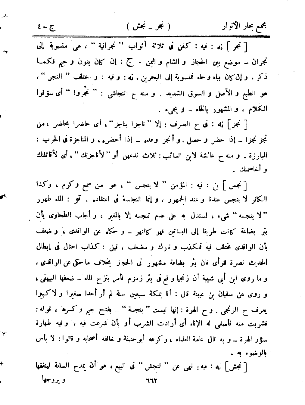 [نجس] ن: فيه: المؤمن "لا ينجس"، هو من سمع وكرم، وكذا الكافر لا ينجس عندنا وعند الجمهور، وإنما النجاسة في اعتقاده. تو: الماء طهور "لا ينجسه" شيء، استدل به على عدم تنجسه إلا بالمغير، وأجاب الطحاوي بأن بئر بضاعة كانت طريقًا إلى البساتين فهو كالنهر- وحكاه عن الواقدي، وضعف بأن الواقدي مختلف فيه فمكذب وتارك ومضعف، قيل: كذاب احتال في إبطال الحديث نصرة للرأي فإن بئر بضاعة مشهور في الحجاز بخلاف ما حكى عن الواقدي، وما روى ابن أبي شيبة أن زنجيًا وقع في بئر زمزم فأمر بنزح الماء- ضعفها البيهقي، وروى عن سفيان بن عيينة قال: أنا بمكة سبعين سنة لم أر أحدًا صغيرًا ولا كبيرًا يعرف ح الزنجي. وح الهرة: إنها ليست "بنجسة"- بفتح جيم وكسرها، قوله: فشربت منه فأصغى له الإناء أي أرادت الشرب أو بأن شرعت فيه، وفيه طهارة سؤر الهرة- وبه قال عامة العلماء، وكرهه أبو حنيفة وخالفه أصحابه وقالوا: لا بأس بالوضوء به.