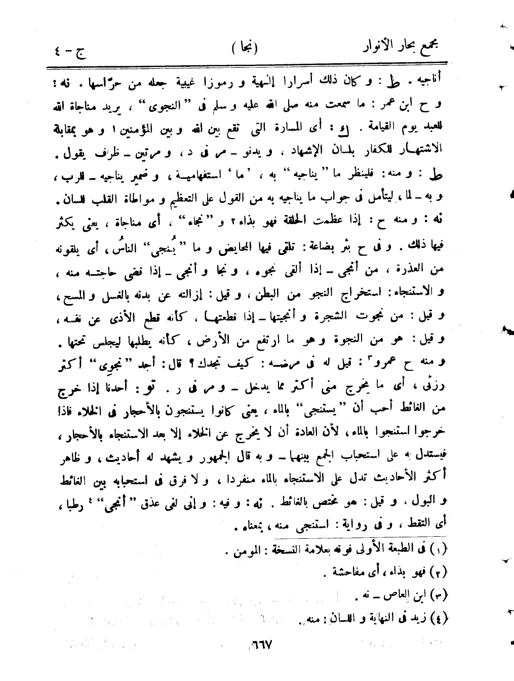 أناجيه. ط: وكان ذلك أسرارًا إلهية ورموزًا غيبية جعله من حراسها. نه: وح ابن عمر: ما سمعت منه صلى الله عليه وسلم في "النجوى"، يريد مناجاة الله للعبد يوم القيامة. ك: أي المسارة التي تقع بين الله وبين المؤمنين وهو بمقابلة الاشتهار للكفار بلسان الإشهاد، ويدنو- مر في د، ومرتين- ظرف يقول. ط: ومنه: فلينظر ما "يناجيه" به، "ما" استفهامية، وضمير يناجيه- للرب، وبه- لما، ليتأمل في جواب ما يناجيه به من القول على التعظيم ومواطأة القلب للسان. نه: ومنه ح: إذا عظمت الحلقة فهو بذاء و"نجاء"، أي مناجاة، يعني يكثر فيها ذلك. وفي ح بئر بضاعة: تلقى فيها المحايض وما "ينجي" الناس، أي يلقونه من العذرة، من أنجى- إذا ألقى نجوه، ونجا وأنجى- إذا قضى حاجته منه، والاستنجاء: استخراج النجو من البطن، وقيل: إزالته عن بدنه بالغسل والمسح، وقيل: من نجوت الشجرة وأنجيتها- إذا قطعتها، كأنه قطع الأذى عن نفسه، وقيل: هو من النجوة وهو ما ارتفع من الأرض، كأنه يطلبها ليجلس تحتها. ومنه ح عمرو: قيل له في مرضه: كيف تجدك؟ قال: أجد "نجوي" أكثر رزئي، أي ما يخرج مني أكثر مما يدخل- ومر في ر. تو: أحدنا إذا خرج من الغائط أحب أن "يستنجي" بالماء، يعني كانوا يستنجون بالأحجار في الخلاء فإذا خرجوا استنجوا بالماء، لأن العادة أن لا يخرج عن الخلاء إلا بعد الاستنجاء بالأحجار، فيستدل به على استحباب الجمع بينهما- وبه قال الجمهور ويشهد له أحاديث، وظاهر أكثر الأحاديث تدل على الاستنجاء بالماء منفردًا، ولا فرق في استحبابه بين الغائط والبول، وقيل: هو مختص بالغائط. نه: وفيه: وإني لفي عذق "أنجي" رطبًا، أي التقط، وفي رواية: استنجى منه، بمعناه.