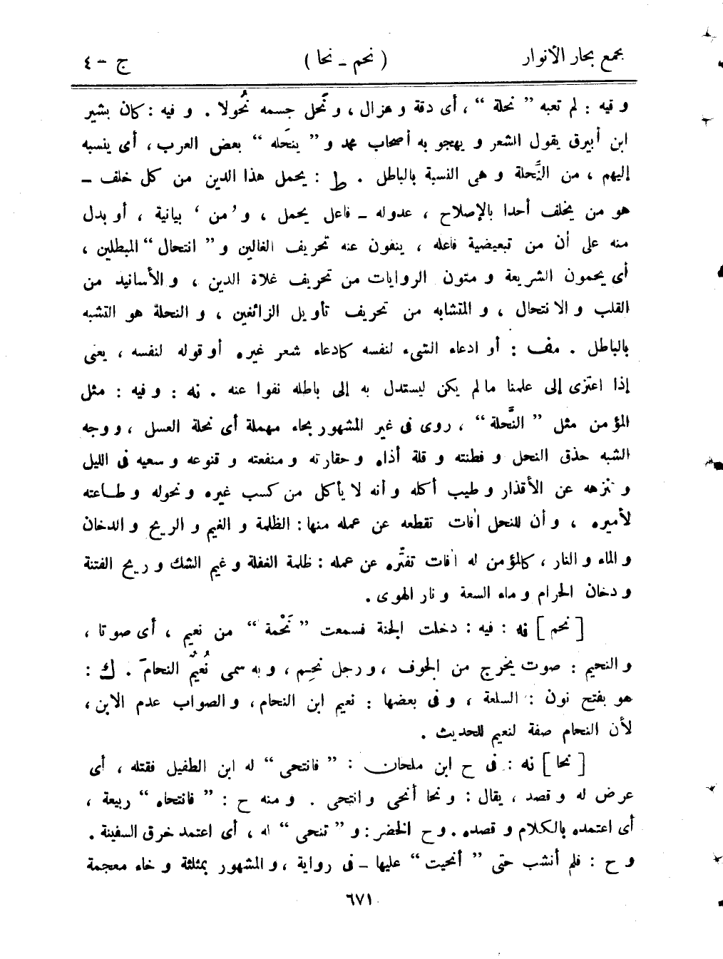 وفيه: لم تعبه "نحلة"، أي دقة وهزال، ونحل جسمه نحولًا. وفيه: كان بشير ابن أبيرق يقول الشعر ويهجو به أصحاب محمد و"ينحله" بعض العرب، أي ينسبه إليهم، من النحلة وهي النسبة بالباطل. ط: يحمل هذا الدين من كل خلف- هو من يخلف أحدًا بالإصلاح، عدوله- فاعل يحمل، و"من" بيانية، أو بدل منه على أن من تبعيضية فاعله، ينفون عنه تحريف الغالين و"انتحال" المبطلين، أي يحمون الشريعة ومتون الروايات من تحريف غلاة الدين، والأسانيد من القلب والانتحال، والمتشابه من تحريف تأويل الزائغين، والنحلة هو التشبه بالباطل. مف: أو ادعاء الشيء لنفسه كادعاء شعر غيره أو قوله لنفسه، يعين إذا اعتزى إلى علمنا ما لم يكن ليستدل به إلى باطله نفوا عنه. نه: وفيه: مثل المؤمن مثل "النحلة"، روى في غير المشهور بحاء مهملة أي نحلة العسل، ووجه الشبه حذق النحل وفطنته وقلة أذاه وحقارته ومنفعته وقنوعه وسعيه في الليل وتنزهه عن الأقذار وطيب أكله وأنه لا يأكل من كسب غيره ونحوله وطاعته لأميره، وأن للنحل آفات تقطعه عن عمله منها: الظلمة والغيم والريح والدخان والماء والنار، كالمؤمن له آفات تفتره عن عمله: ظلمة الغفلة وغيم الشك وريح الفتنة ودخان الحرام وماء السعة ونار الهوى.