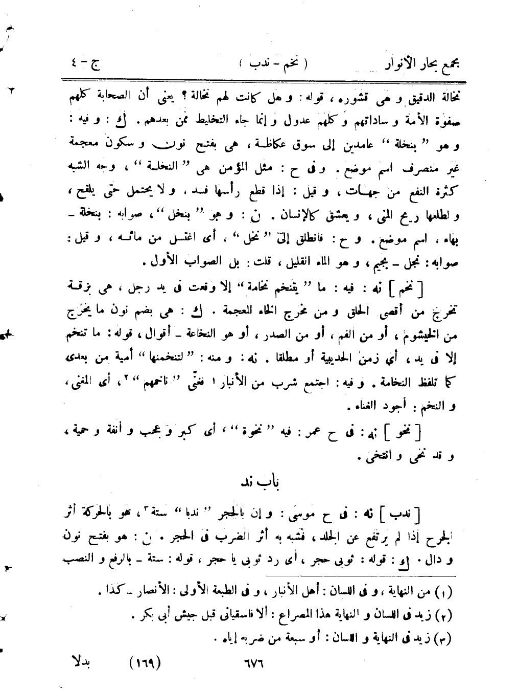 [ندب] نه: في ح موسى: وإن بالحجر "ندبا" ستة، هو بالحركة أثر الجرح إذا لم يرتفع عن الجلد، فشبه به أثر الضرب في الحجر. ن: هو بفتح نون ودال. ك: قوله: ثوبي حجر، أي رد ثوبي يا حجر، قوله: ستة- بالرفع والنصب