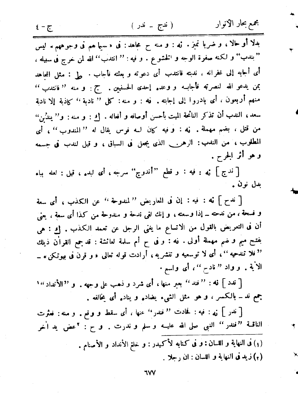 [ندح] نه: فيه: إن في المعاريض "لمندوحة" عن الكذب، أي سعة وفسحة، من ندحته- إذا وسعته، وإنك لفي ندحة ومندوحة من كذا أي سعة، يعني أن في التعريض بالقول من الاتساع ما يغني الرجل عن تعمد الكذب. ك: هي بفتح ميم وضم مهملة أولى. نه: وفي ح أم سلمة لعائشة: قد جمع القرآن ذيلك "فلا تندحيه"، أي لا توسعيه وتنشريه، أرادت قوله تعالى "وقرن في بيوتكن"- الآية. وواد "نادح"، أي واسع.