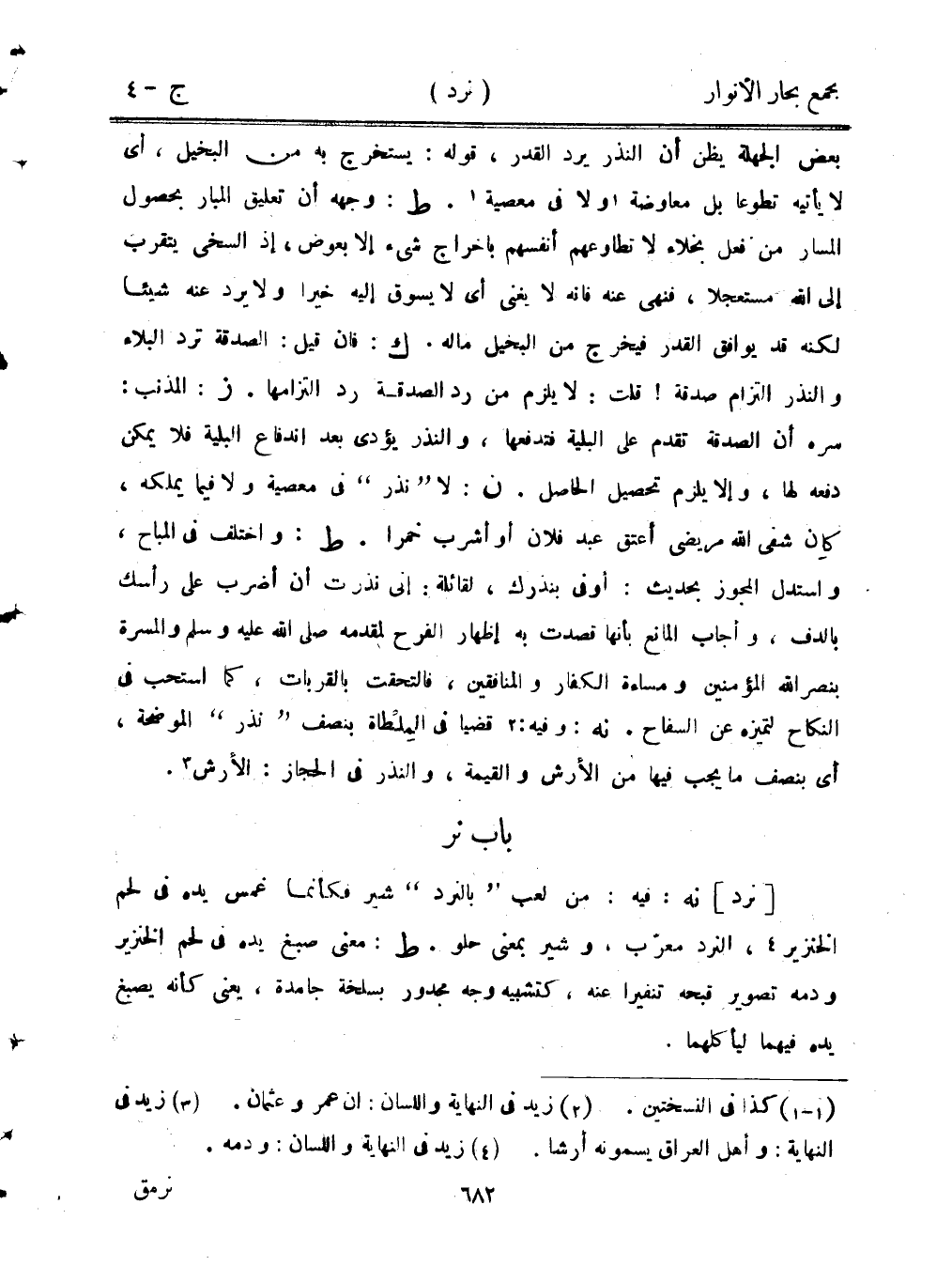 بعض الجهلة يظن أن النذر يرد القدر، قوله: يستخرج به من البخيل، أي لا يأتيه تطوعًا بل معاوضة ولا في معصية. ط: وجهه أن تعليق المبار بحصول المسار من فعل بخلاء لا تطاوعهم أنفسهم بإخراج شيء إلا بعوض، غذ السخي يتقرب إلى الله مستعجلًا، فنهى عنه فإنه لا يغني أي لا يسوق إليه خيرًا ولا يرد عنه شيئًا لكنه قد يوافق القدر فيخرج من البخيل ماله. ك: فإن قيل: الصدقة ترد البلاء والنذر التزام صدقة! قلت: لا يلزم من رد الصدقة رد التزامها. ز: المذنب: سره أن الصدقة تقدم على البلية فتدفعها، والنذر يؤدي بعد اندفاع البلية فلا يمكن دفعه لها، وإلا يلزم تحصيل الحاصل. ن: لا "نذر" في معصية ولا فيما يملكه، كان شفى الله مريضي أعتق عبد فلان أو أشرب خمرًا. ط: واختلف في المباح، واستدل المجوز بحديث: أوفى بنذرك، لقائلة: إني نذرت أن أضرب على رأسك بالدف، وأجاب المانع بأنها قصدت به إظهار الفرح لمقدمه صلى الله عليه وسلم والمسرة بنصر الله المؤمنين ومساءة الكفار والمنافقين، فالتحقت بالقربات، كما استحب في النكاح لتميزه عن السفاح. نه: وفيه: قضيا فيالملطاة بنصف "نذر" الموضحة، أي بنصف ما يجب فيها من الأرش والقيمة، والنذر في الحجاز: الأرش.