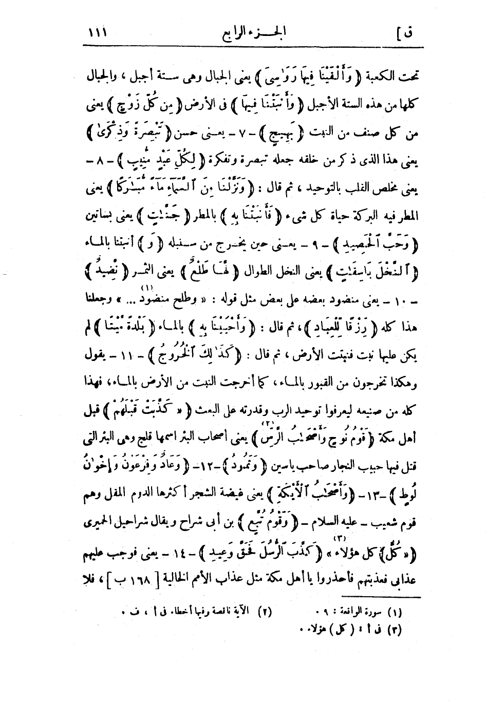 تحت الكعبة وَأَلْقَيْنا فِيها رَواسِيَ يعني الجبال وهي ستة أجبل، والجبال كلها من هذه الستة الأجبل وَأَنْبَتْنا فِيها في الأرض مِنْ كُلِّ زَوْجٍ يعني من كل صنف من النبت بَهِيجٍ- 7- يعنى حسن تَبْصِرَةً وَذِكْرى يعني هذا الذي ذكر من خلقه جعله تبصرة وتفكرة لِكُلِّ عَبْدٍ مُنِيبٍ- 8- يعنى مخلص القلب بالتوحيد، ثم قال: وَنَزَّلْنا مِنَ السَّماءِ مَاءً مُبارَكاً يعنى المطرفيه البركة حياة كل شيء فَأَنْبَتْنا بِهِ بالمطر جَنَّاتٍ يعنى بساتين وَحَبَّ الْحَصِيدِ- 9- يعني حين يخرج من سنبلة وَأنبتنا بالماء النَّخْلَ باسِقاتٍ يعني النخل الطوال لَها طَلْعٌ يعني الثمر نَضِيدٌ- 10- يعني منضود بعضه على بعض مثل قوله: وَطَلْحٍ مَنْضُودٍ ... «1» وجعلنا هذا كله رِزْقاً لِلْعِبادِ، ثم قال: وَأَحْيَيْنا بِهِ بالماء بَلْدَةً مَيْتاً لم يكن عليها نبت فنبتت الأرض، ثم قال: كَذلِكَ الْخُرُوجُ- 11- يقول وهكذا تخرجون من القبور بالماء، كما أخرجت النبت من الأرض بالماء، فهذا كله من صنيعه ليعرفوا توحيد الرب وقدرته على البعث «كَذَّبَتْ قَبْلَهُمْ» قبل أهل مكة قَوْمُ نُوحٍ وَأَصْحابُ الرَّسِّ «2» يعنى أصحاب البئر اسمها قلج وهي البئر التي قتل فيها حبيب النجار صاحب ياسين وَثَمُودُ- 12- وَعادٌ وَفِرْعَوْنُ وَإِخْوانُ لُوطٍ- 13- وَأَصْحابُ الْأَيْكَةِ يعني غيضة الشجر أكثرها الدوم المقل وهم قوم شعيب- عليه السلام- وَقَوْمُ تُبَّعٍ بن أبي شراح ويقال شراحيل الحميري «كُلٌّ كل هؤلاء» «3» كَذَّبَ الرُّسُلَ فَحَقَّ وَعِيدِ- 14- يعنى فوجب عليهم عذابي فعذبتهم فاحذروا يا أهل مكة مثل عذاب الأمم الخالية [168 ب] ، فلا
