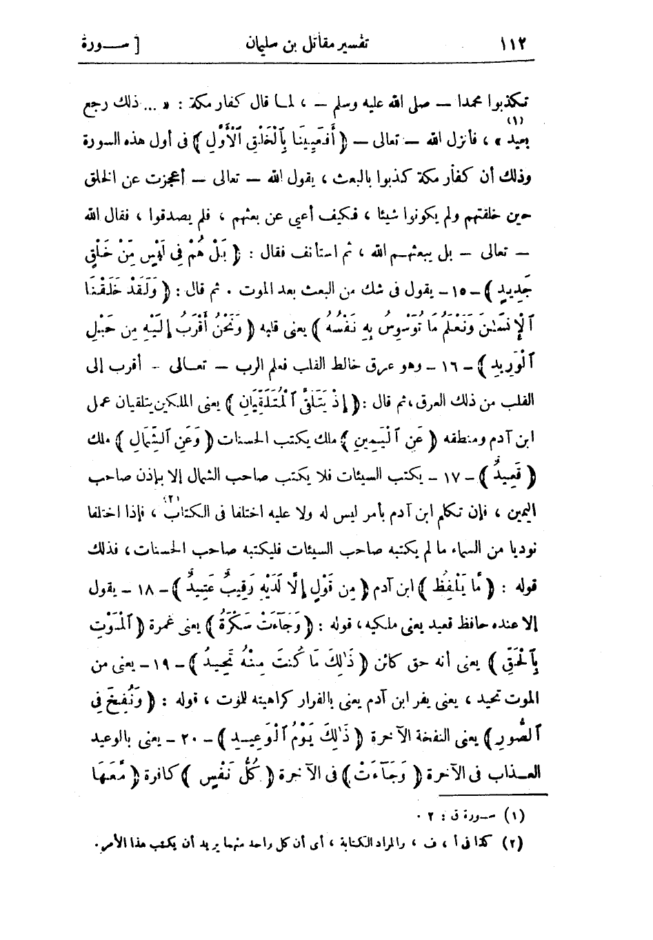 تكذبوا محمدا- صلى الله عليه وسلم-، لما قال كفار مكة: ... ذلِكَ رَجْعٌ بَعِيدٌ «1» ، فأنزل الله- تعالى- أَفَعَيِينا بِالْخَلْقِ الْأَوَّلِ فى أول هذه السورة وذلك أن كفار مكة كذبوا بالبعث، يقول الله- تعالى- أعجزت عن الخلق حين خلقتهم ولم يكونوا شيئا، فكيف أعيى عن بعثهم، فلم يصدقوا، فقال الله- تعالى- بل يبعثهم الله، ثم استأنف فقال: بَلْ هُمْ فِي لَبْسٍ مِنْ خَلْقٍ جَدِيدٍ- 15- يقول في شك من البعث بعد الموت. ثم قال: وَلَقَدْ خَلَقْنَا الْإِنْسانَ وَنَعْلَمُ مَا تُوَسْوِسُ بِهِ نَفْسُهُ يعني قلبه وَنَحْنُ أَقْرَبُ إِلَيْهِ مِنْ حَبْلِ الْوَرِيدِ- 16- وهو عرق خالط القلب فعلم الرب- تعالى- أقرب إلى القلب من ذلك العرق، ثم قال: إِذْ يَتَلَقَّى الْمُتَلَقِّيانِ يعني الملكين يتلقيان عمل ابن آدم ومنطقه عَنِ الْيَمِينِ ملك يكتب الحسنات وَعَنِ الشِّمالِ ملك قَعِيدٌ- 17- يكتب السيئات فلا يكتب صاحب الشمال إلا بإذن صاحب اليمين، فإن تكلم ابن آدم بأمر ليس له ولا عليه اختلفا في الكتاب «2» ، فإذا اختلفا نوديا من السماء ما لم يكتبه صاحب السيئات فليكتبه صاحب الحسنات، فذلك قوله: مَا يَلْفِظُ ابن آدم مِنْ قَوْلٍ إِلَّا لَدَيْهِ رَقِيبٌ عَتِيدٌ- 18- يقول إلا عنده حافظ قعيد يعني ملكيه، قوله: وَجاءَتْ سَكْرَةُ يعنى غمرة الْمَوْتِ بِالْحَقِّ يعني أنه حق كائن ذلِكَ مَا كُنْتَ مِنْهُ تَحِيدُ- 19- يعني من الموت تحيد، يعني يفر ابن آدم يعنى بالفرار كراهيته للموت، قوله: وَنُفِخَ فِي الصُّورِ يعنى النفخة الآخرة ذلِكَ يَوْمُ الْوَعِيدِ- 20- يعنى بالوعيد العذاب فى الآخرة وَجاءَتْ في الآخرة كُلُّ نَفْسٍ كافرة مَعَها سائِقٌ