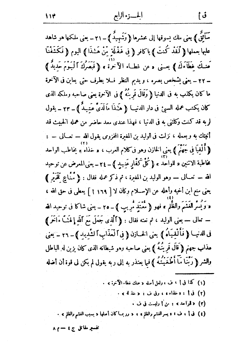 أَلْقِيا فِي جَهَنَّمَ يعنى الخازن وهو فى كلام العرب، «خذاه» «2» يخاطب الواحد مخاطبة الاثنين «للواحد» «3» كُلَّ كَفَّارٍ عَنِيدٍ- 24- يعني المعرض عن توحيد الله- تعالى- وهو الوليد بن المغيرة، ثم ذكر عمله فقال: مَنَّاعٍ لِلْخَيْرِ يعني منع ابن أخيه وأهله عن الإسلام وكان لا [169 أ] يعطي في حق الله، «ويسر الغشم والظلم» «4» فهو مُعْتَدٍ مُرِيبٍ- 25- يعني شاكا في توحيد الله- تعالى- يعنى الوليد، ثم نعته فقال: الَّذِي جَعَلَ مَعَ اللَّهِ إِلهاً آخَرَ فى الدنيا فَأَلْقِياهُ يعني الخازن فِي الْعَذابِ الشَّدِيدِ- 26- يعنى عذاب جهنم قالَ قَرِينُهُ يعني صاحبه وهو شيطانه الذي كان يزين له الباطل والشر رَبَّنا ما أَطْغَيْتُهُ فيما يعتذر به إلى ربه يقول لم يكن لي قوة أن أضله