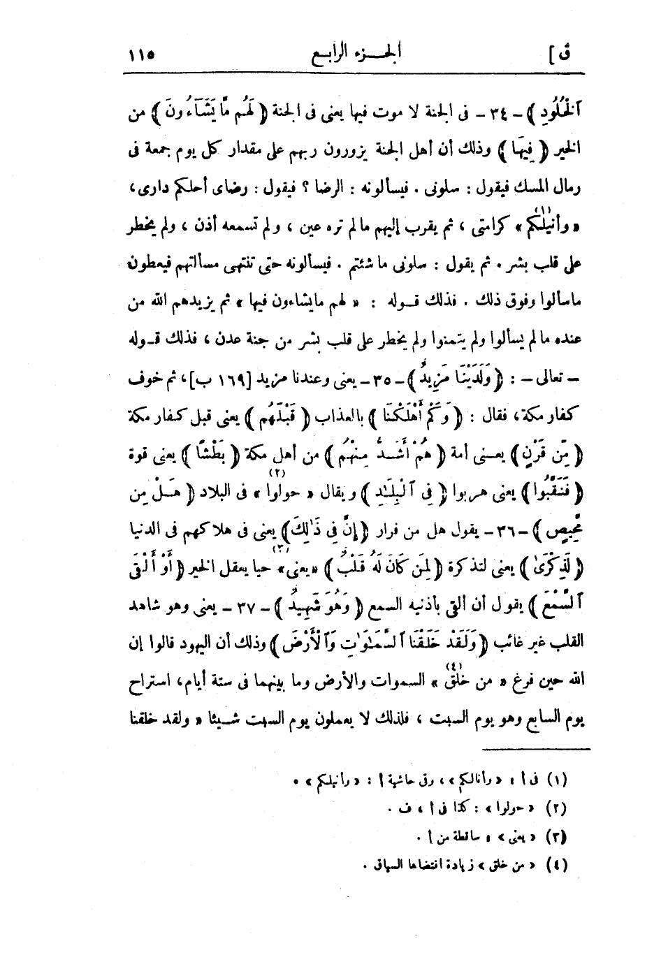 في الجنة لا موت فيها يعني في الجنة لَهُمْ ما يَشاؤُنَ من الخير فِيها وذلك أن أهل الجنة يزورون ربهم على مقدار كل يوم جمعة في رمال المسك فيقول: سلوني. فيسألونه: الرضا؟ فيقول: رضاي أحلكم داري، «وأنيلكم «1» » كرامتي، ثم يقرب إليهم ما لم تره عين، ولم تسمعه أذن، ولم يخطر على قلب بشر. ثم يقول: سلوني ما شئتم. فيسألونه حتى تنتهي مسألتهم فيعطون ما سألوا وفوق ذلك. فذلك قوله: «لَهُمْ ما يَشاؤُنَ فِيها» ثم يزيدهم الله من عنده ما لم يسألوا ولم يتمنوا ولم يخطر على قلب بشر من جنة عدن، فذلك قوله- تعالى-: وَلَدَيْنا مَزِيدٌ- 35- يعنى وعندنا مزيد [169 ب] ، ثم خوف كفار مكة، فقال: وَكَمْ أَهْلَكْنا بالعذاب قَبْلَهُمْ يعني قبل كفار مكة مِنْ قَرْنٍ يعنى أمة هُمْ أَشَدُّ مِنْهُمْ من أهل مكة بَطْشاً يعني قوة فَنَقَّبُوا يعني هربوا فِي الْبِلادِ ويقال «حولوا» «2» في البلاد هَلْ مِنْ مَحِيصٍ- 36- يقول هل من فرار إِنَّ فِي ذلِكَ يعني في هلاكهم في الدنيا لَذِكْرى يعني لتذكرة لِمَنْ كانَ لَهُ قَلْبٌ «يعني» «3» حيا يعقل الخير أَوْ أَلْقَى السَّمْعَ يقول أن ألقى بأذنيه السمع وَهُوَ شَهِيدٌ- 37- يعني وهو شاهد القلب غير غائب وَلَقَدْ خَلَقْنَا السَّماواتِ وَالْأَرْضَ وذلك أن اليهود قالوا إن الله حين فرغ «من خلق» «4» السموات والأرض وما بينهما في ستة أيام، استراح يوم السابع وهو يوم السبت، فلذلك لا يعملون يوم السبت شيئا «وَلَقَدْ خَلَقْنَا السَّماواتِ وَالْأَرْضَ»