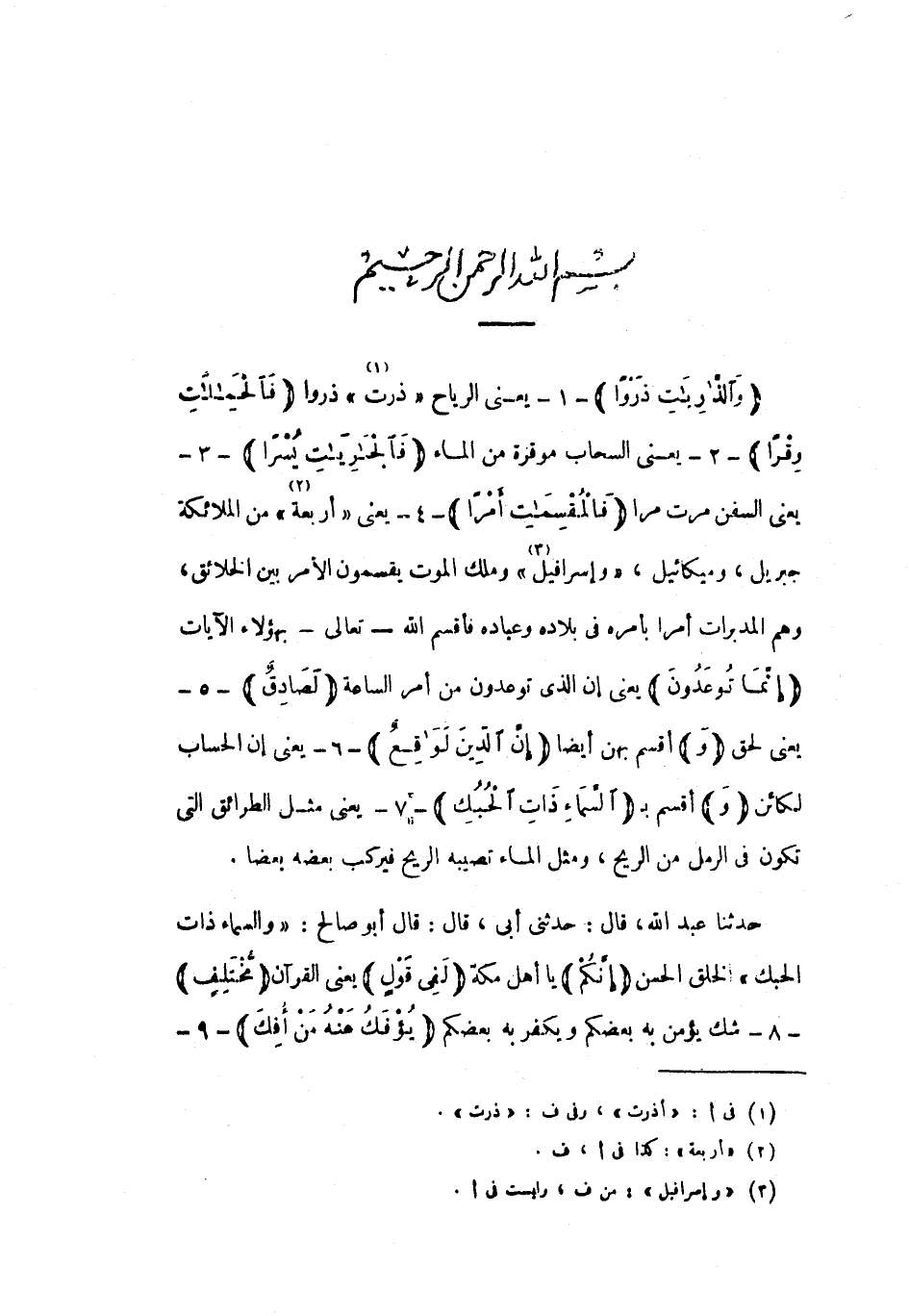 بِسْمِ اللَّهِ الرَّحْمنِ الرَّحِيمِ وَالذَّارِياتِ ذَرْواً- 1- يعنى الرياح «ذرت» «1» ذروا فَالْحامِلاتِ وِقْراً- 2- يعني السحاب موقرة من الماء فَالْجارِياتِ يُسْراً- 3- يعني السفن مرت مرا فَالْمُقَسِّماتِ أَمْراً- 4- يعني «أربعة» «2» من الملائكة جبريل، وميكائيل، «وإسرافيل» «3» وملك الموت يقسمون الأمر بين الخلائق، وهم المدبرات أمرا بأمره في بلاده وعباده فأقسم الله- تعالى- بهؤلاء الآيات إِنَّما تُوعَدُونَ يعني إن الذي توعدون من أمر الساعة لَصادِقٌ- 5- يعنى لحق وَأقسم بهن أيضا إِنَّ الدِّينَ لَواقِعٌ- 6- يعنى إن الحساب لكائن وَأقسم ب السَّماءِ ذاتِ الْحُبُكِ- 7- يعني مثل الطرائق التي تكون في الرمل من الريح، ومثل الماء تصيبه الريح فيركب بعضه بعضا.