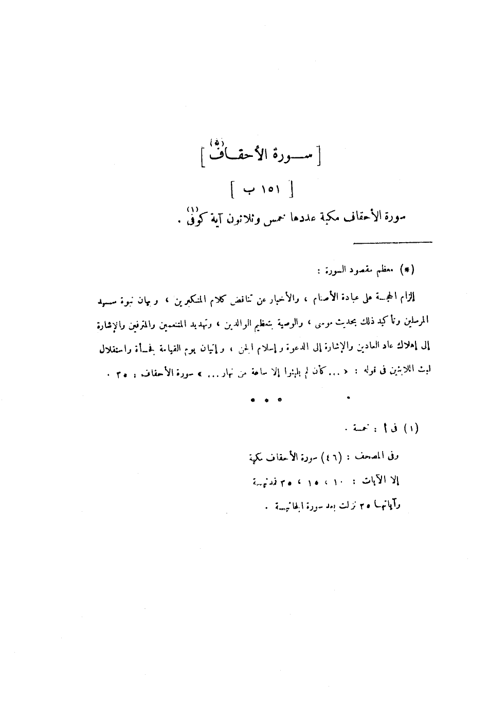 [سورة الأحقاف «1» ] [151 ب] سورة الأحقاف مكية عددها خمس وثلاثون آية كوفى «2» .