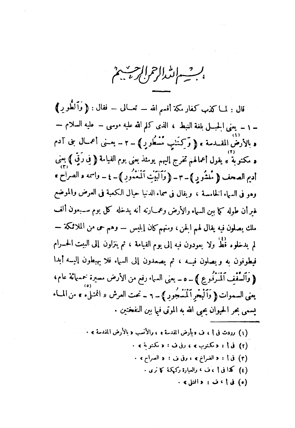 بِسْمِ اللَّهِ الرَّحْمنِ الرَّحِيمِ قال: لما كذب كفار مكة أقسم الله- تعالى- فقال: وَالطُّورِ- 1- يعني الجبل بلغة النبط، الذي كلم الله عليه موسى- عليه السلام- «بالأرض «1» المقدسة» وَكِتابٍ مَسْطُورٍ- 2- يعني أعمال بني آدم «مكتوبة» «2» يقول أعمالهم تخرج إليهم يومئذ يعني يوم القيامة فِي رَقٍّ يعني أديم الصحف مَنْشُورٍ- 3- وَالْبَيْتِ الْمَعْمُورِ- 4- واسمه «الصراح» «3» وهو في السماء الخامسة، ويقال في سماء الدنيا حيال الكعبة في العرض والموضع غير أن طوله كما بين السماء والأرض وعمارته أنه يدخله كل يوم سبعون ألف ملك يصلون فيه يقال لهم الجن، ومنهم كان إبليس- وهم حي من الملائكة- لم يدخلوه قط «4» ولا يعودون فيه إلى يوم القيامة، ثم ينزلون إلى البيت الحرام فيطوفون به ويصلون فيه، ثم يصعدون إلى السماء فلا يهبطون إليه أبدا وَالسَّقْفِ الْمَرْفُوعِ- 5- يعنى السماء رفع من الأرض مسيرة خمسمائة عام، يعني السموات وَالْبَحْرِ الْمَسْجُورِ- 6- تحت العرش «الممتلئ» «5» من الماء يسمى بحر الحيوان يحيي الله به الموتى فيما بين النفختين.