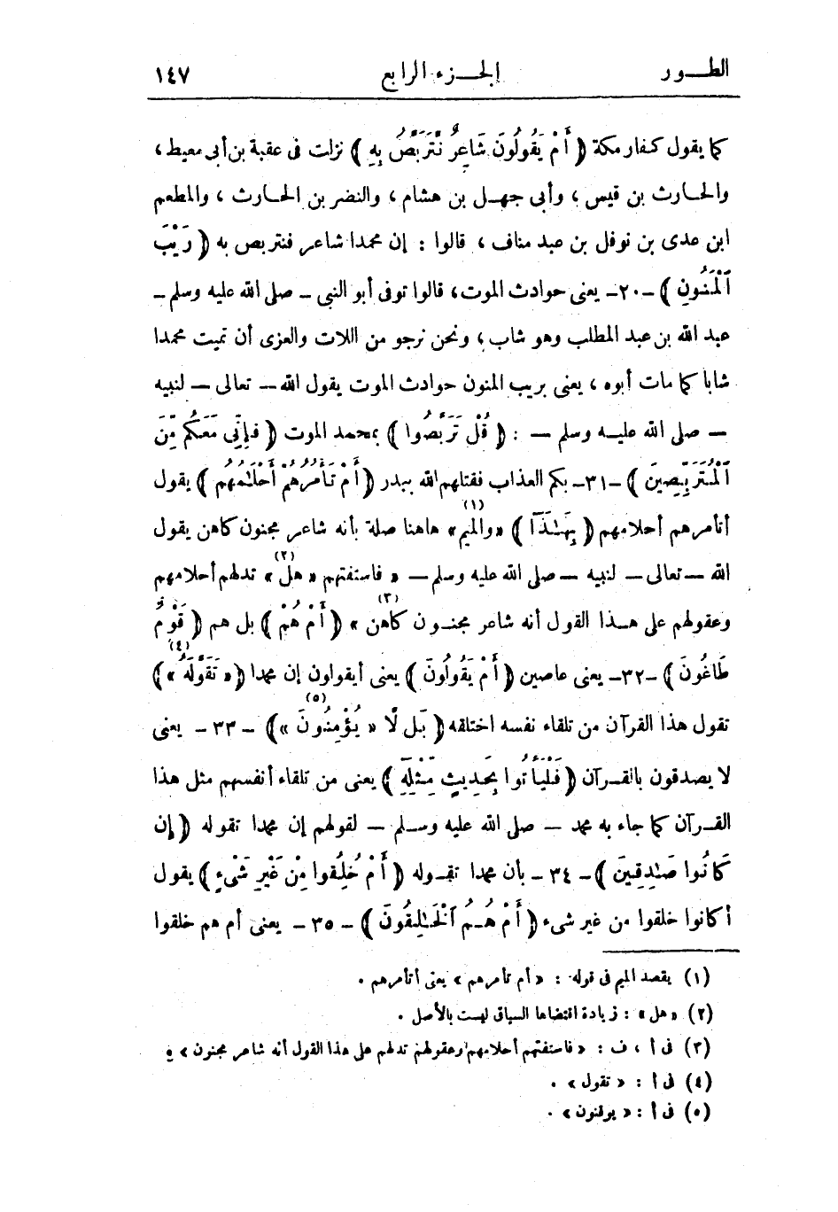 كما يقول كفار مكة أَمْ يَقُولُونَ شاعِرٌ نَتَرَبَّصُ بِهِ نزلت في عقبة بن أبي معيط، والحارث بن قيس، وأبي جهل بن هشام، والنضر بن الحارث، والمطعم ابن عدي بن نوفل بن عبد مناف، قالوا: إن محمدا شاعر فنتربص به رَيْبَ الْمَنُونِ- 30- يعني حوادث الموت، قالوا توفي أبو النبي- صَلَّى اللَّهُ عَلَيْهِ وَسَلَّمَ- عَبْد اللَّه بن عبد المطلب وهو شاب، ونحن نرجو من اللات والعزى أن تميت محمدا شابا كما مات أبوه، يعني بريب المنون حوادث الموت يقول الله- تعالى- لنبيه- صلى الله عليه وسلم-: قُلْ تَرَبَّصُوا بمحمد الموت فَإِنِّي مَعَكُمْ مِنَ الْمُتَرَبِّصِينَ- 31- بكم العذاب فقتلهم الله ببدر أَمْ تَأْمُرُهُمْ أَحْلامُهُمْ «1» يقول أتأمرهم أحلامهم بِهذا «والميم» هاهنا صلة بأنه شاعر مجنون كاهن يقول الله- تعالى- لنبيه- صلى الله عليه وسلم- «فاستفتهم «هل» «2» تدلهم أحلامهم وعقولهم على هذا القول أنه شاعر مجنون كاهن «3» » أَمْ هُمْ بل هم قَوْمٌ طاغُونَ- 32- يعني عاصين أَمْ يَقُولُونَ يعني أيقولون إن محمدا «تَقَوَّلَهُ» «4» تقول هذا القرآن من تلقاء نفسه اختلقه بَلْ لا «يُؤْمِنُونَ» «5» - 33- يعني لا يصدقون بالقرآن فَلْيَأْتُوا بِحَدِيثٍ مِثْلِهِ يعني من تلقاء أنفسهم مثل هذا القرآن كما جاء به محمد- صَلَّى اللَّهُ عَلَيْهِ وَسَلَّمَ- لقولهم إن محمدا تقوله إِنْ كانُوا صادِقِينَ- 34- بأن محمدا تقوله أَمْ خُلِقُوا مِنْ غَيْرِ شَيْءٍ يقول أكانوا خلقوا من غير شيء أَمْ هُمُ الْخالِقُونَ- 35- يعنى أم هم خلقوا