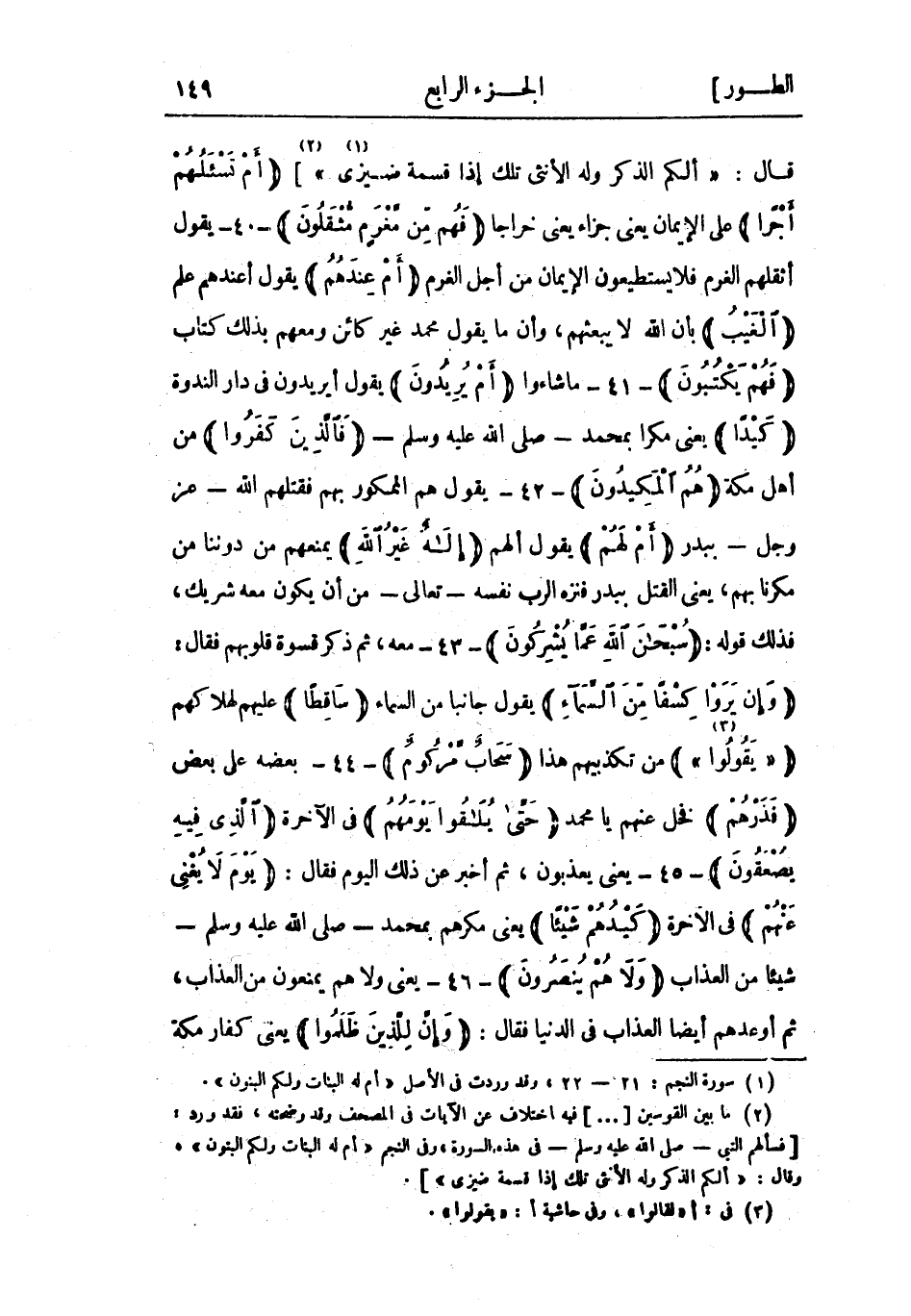 (2) ما بين القوسين [ ... ] فيه اختلاف عن الآيات فى المصحف وقد وضحته، فقد ورد، [فسألهم النبي- صلى الله عليه وسلم- في هذه السورة، وفى النجم «أَمْ لَهُ الْبَناتُ وَلَكُمُ الْبَنُونَ» ، وقال: «أَلَكُمُ الذَّكَرُ وَلَهُ الْأُنْثى تِلْكَ إِذاً قِسْمَةٌ ضِيزى» ] .