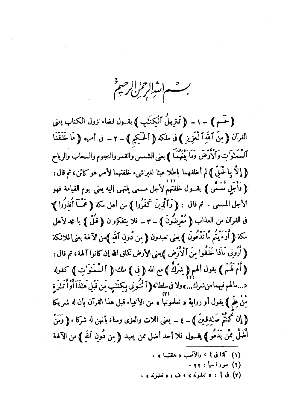 بِسْمِ اللَّهِ الرَّحْمنِ الرَّحِيمِ حم- 1- تَنْزِيلُ الْكِتابِ يقول قضاء نزول الكتاب يعني القرآن مِنَ اللَّهِ الْعَزِيزِ في ملكه الْحَكِيمِ- 2- في أمره ما خَلَقْنَا السَّماواتِ وَالْأَرْضَ وَما بَيْنَهُما يعني الشمس والقمر والنجوم والسحاب والرياح إِلَّا بِالْحَقِّ لم أخلقهما باطلا عبثا لغير شيء خلقتهما لأمر هو كائن، ثم قال: