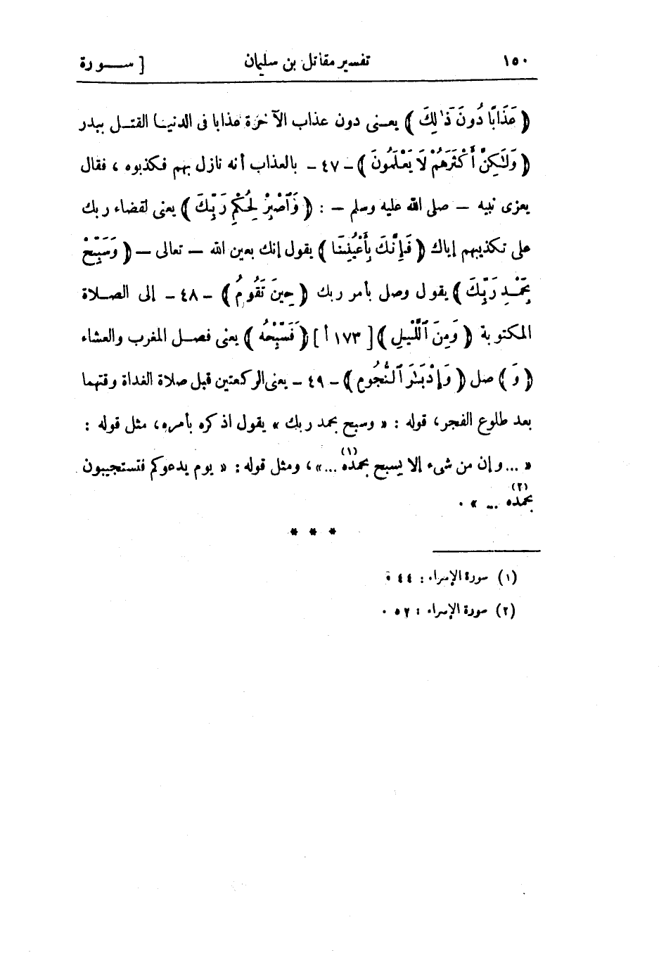 عَذاباً دُونَ ذلِكَ يعني دون عذاب الآخرة عذابا في الدنيا القتل ببدر وَلكِنَّ أَكْثَرَهُمْ لا يَعْلَمُونَ- 47- بالعذاب أنه نازل بهم فكذبوه، فقال يعزي نبيه- صلى الله عليه وسلم-: وَاصْبِرْ لِحُكْمِ رَبِّكَ يعني لقضاء ربك على تكذيبهم إياك فَإِنَّكَ بِأَعْيُنِنا يقول إنك بعين الله- تعالى- وَسَبِّحْ بِحَمْدِ رَبِّكَ يقول وصل بأمر ربك حِينَ تَقُومُ- 48- إلى الصلاة المكتوبة وَمِنَ اللَّيْلِ [173 أ] فَسَبِّحْهُ يعني فصل المغرب والعشاء وَصل وَإِدْبارَ النُّجُومِ- 49- يعني الركعتين قبل صلاة الغداة وقتهما بعد طلوع الفجر، قوله: وَسَبِّحْ بِحَمْدِ رَبِّكَ يقول اذكره بأمره، مثل قوله: