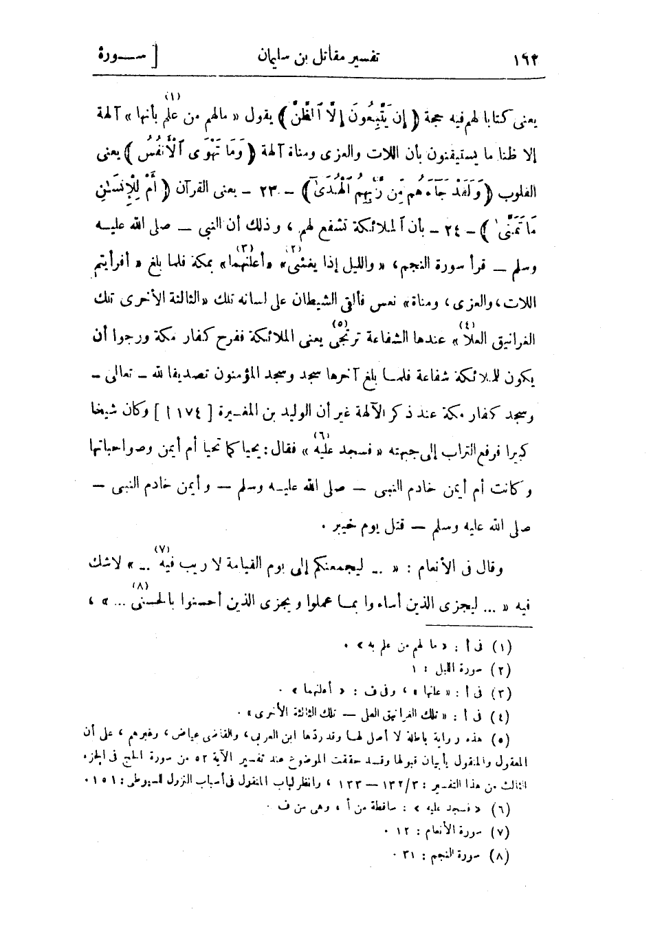 يعني كتابا لهم فيه حجة إِنْ يَتَّبِعُونَ إِلَّا الظَّنَّ يقول «ما لهم من علم «1» بأنها» آلهة إلا ظنا ما يستيفتون بأن اللات والعزى ومناة آلهة وَما تَهْوَى الْأَنْفُسُ يعني القلوب وَلَقَدْ جاءَهُمْ مِنْ رَبِّهِمُ الْهُدى - 23- يعنى القرآن أَمْ لِلْإِنْسانِ ما تَمَنَّى- 24- بأن الملائكة تشفع لهم، وذلك أن النبي- صلى الله عليه وسلم- قرأ سورة النجم، «وَاللَّيْلِ إِذا يَغْشى «2» » «أعلنهما «3» » بمكة فلما بلغ «أَفَرَأَيْتُمُ اللَّاتَ، وَالْعُزَّى، وَمَناةَ» نعس فألقى الشيطان على لسانه تلك «الثالثة الأخرى تلك الغرانيق العلا «4» » عندها الشفاعة ترتجى «5» يعني الملائكة ففرح كفار مكة ورجوا أن يكون للملائكة شفاعة فلما بلغ آخرها سجد وسجد المؤمنون تصديفا لله- تعالى- وسجد كفار مكة عند ذكر الآلهة غير أن الوليد بن المغيرة [174 أ] وكان شيخا كبيرا فرفع التراب إلى جبهته «فسجد عليه «6» » فقال: يحيا كما تحيا أم أيمن وصواحباتها وكانت أم أيمن خادم النبي- صلى الله عليه وسلم- وأيمن خادم النبي- صلى الله عليه وسلم- قتل يوم خيبر.