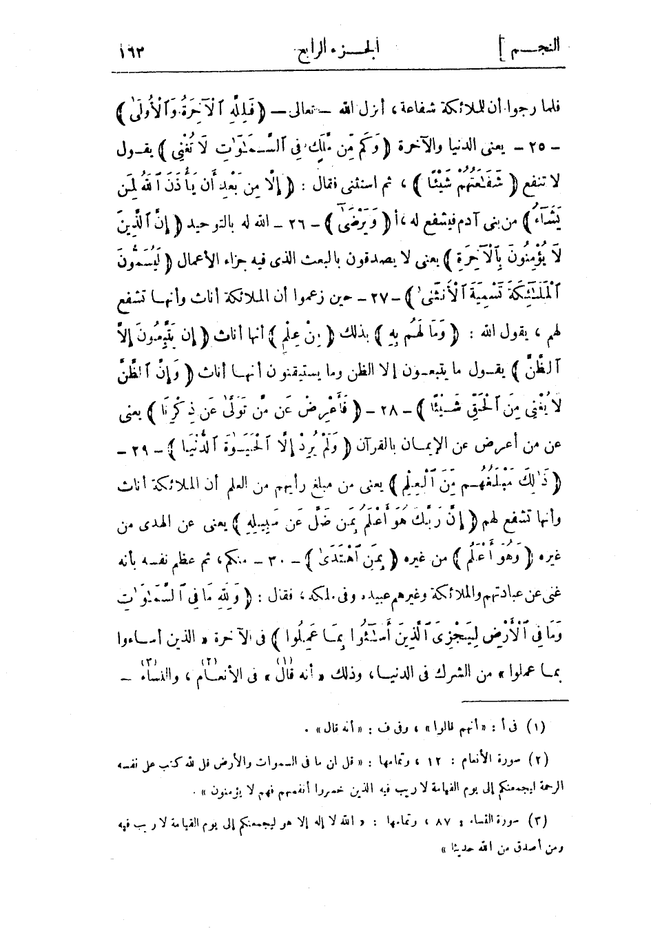 فلما رجوا أن للملائكة شفاعة، أنزل الله- تعالى- فَلِلَّهِ الْآخِرَةُ وَالْأُولى - 25- يعني الدنيا والآخرة وَكَمْ مِنْ مَلَكٍ فِي السَّماواتِ لا تُغْنِي يقول لا تنفع شَفاعَتُهُمْ شَيْئاً، ثم استثنى فقال: إِلَّا مِنْ بَعْدِ أَنْ يَأْذَنَ اللَّهُ لِمَنْ يَشاءُ من بنى آدم فيشفع له، أوَيَرْضى - 26- الله له بالتوحيد إِنَّ الَّذِينَ لا يُؤْمِنُونَ بِالْآخِرَةِ يعني لا يصدقون بالبعث الذي فيه جزاء الأعمال لَيُسَمُّونَ الْمَلائِكَةَ تَسْمِيَةَ الْأُنْثى - 27- حين زعموا أن الملائكة إناث وأنها تشفع لهم، يقول الله: وَما لَهُمْ بِهِ بذلك مِنْ عِلْمٍ أنها إناث إِنْ يَتَّبِعُونَ إِلَّا الظَّنَّ يقول ما يتبعون إلا الظن وما يستيقنون أنها إناث وَإِنَّ الظَّنَّ لا يُغْنِي مِنَ الْحَقِّ شَيْئاً- 28- فَأَعْرِضْ عَنْ مَنْ تَوَلَّى عَنْ ذِكْرِنا يعني عن من أعرض عن الإيمان بالقرآن وَلَمْ يُرِدْ إِلَّا الْحَياةَ الدُّنْيا- 29- ذلِكَ مَبْلَغُهُمْ مِنَ الْعِلْمِ يعني من مبلغ رأيهم من العلم أن الملائكة إناث وأنها تشفع لهم إِنَّ رَبَّكَ هُوَ أَعْلَمُ بِمَنْ ضَلَّ عَنْ سَبِيلِهِ يعني عن الهدى من غيره وَهُوَ أَعْلَمُ من غيره بِمَنِ اهْتَدى - 30- منكم، ثم عظم نفسه بأنه غني عن عبادتهم والملائكة وغيرهم عبيد وفى ملكه، فقال: وَلِلَّهِ ما فِي السَّماواتِ وَما فِي الْأَرْضِ لِيَجْزِيَ الَّذِينَ أَساؤُا بِما عَمِلُوا فى الآخرة «الَّذِينَ أَساؤُا بِما عَمِلُوا» من الشرك فى الدنيا، وذلك «أنه قال «1» » فى الأنعام «2» ، والنساء «3» -