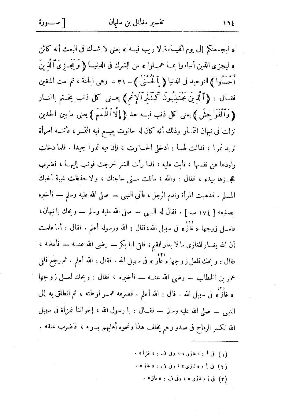 أنه كان له حانوت يبيع فيه التمر، فأتته امرأة تريد تمرا، فقالت لها: ادخلي الحانوت، فإن فيه تمرا جيدا. فلما دخلت راودها عن نفسها، فأبت عليه، فلما رأت الشر خرجت فوثب إليها، فضرب عجزها بيده، فقال: والله، ما نلت مني حاجتك، ولا حفظت غيبة أخيك المسلم. فذهبت المرأة وندم الرجل، فأتى النَّبِيّ- صَلَّى اللَّهُ عَلَيْهِ وَسَلَّمَ- فَأَخْبَرَه بصنيعه [174 ب] . فقال له النبي- صلى الله عليه وسلم- ويحك يا نبهان، فلعل زوجها «غاز «1» » في سبيل الله، فقال: الله ورسوله أعلم. فقال: أما علمت أن الله يغار للغازي ما لا يغار للمقيم، فلقي أبا بكر- رضي الله عنه- فأعلمه، فقال: ويحك فلعل زوجها «غاز «2» » في سبيل الله. فقال: الله أعلم. ثم رجع فلقي عمر بن الخطاب- رضي الله عنه- فأخبره، فقال: ويحك لعل زوجها «غاز «3» » في سبيل الله. قال: الله أعلم. فصرعه عمر فوطئه، ثم انطلق به إلى النبي- صلى الله عليه وسلم- فقال: يا رسول الله، إخواننا غزاة في سبيل الله تكسر الرماح في صدورهم يخلف هذا ونحوه أهليهم بسوء، فاضرب عنقه.
