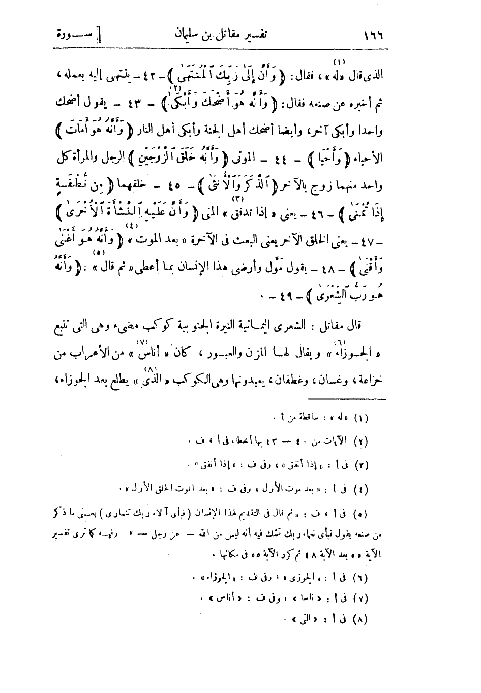 الذي قال «له «1» » فقال: وَأَنَّ إِلى رَبِّكَ الْمُنْتَهى - 42- ينتهى إليه بعمله، ثم أخبره عن صنعه فقال: وَأَنَّهُ هُوَ أَضْحَكَ وَأَبْكى «2» - 43- يقول أضحك واحدا وأبكى آخر، وأيضا أضحك أهل الجنة وأبكى أهل النار وَأَنَّهُ هُوَ أَماتَ الأحياء وَأَحْيا- 44- الموتى وَأَنَّهُ خَلَقَ الزَّوْجَيْنِ الرجل والمرأة كل واحد منهما زوج بالآخر الذَّكَرَ وَالْأُنْثى - 45- خلقهما مِنْ نُطْفَةٍ إِذا تُمْنى - 46- يعني «إذا تدفق «3» » المني وَأَنَّ عَلَيْهِ النَّشْأَةَ الْأُخْرى - 47- يعني الخلق الآخر يعني البعث في الآخرة «بعد الموت «4» » وَأَنَّهُ هُوَ أَغْنى وَأَقْنى - 48- يقول مول وأرضى هذا الإنسان بما أعطى «ثم قال» : «5» وَأَنَّهُ هُوَ رَبُّ الشِّعْرى - 49- قال مُقَاتِلُ: الشعرى اليمانية النيرة الجنوبية كوكب مضيء وهي التي تتبع «الجوزاء «6» » ويقال لها المزن والعبور، كان «أناس «7» » من الأعراب من خزاعة، وغسان، وغطفان، يعبدونها وهي الكوكب «الذي «8» » يطلع بعد الجوزاء،