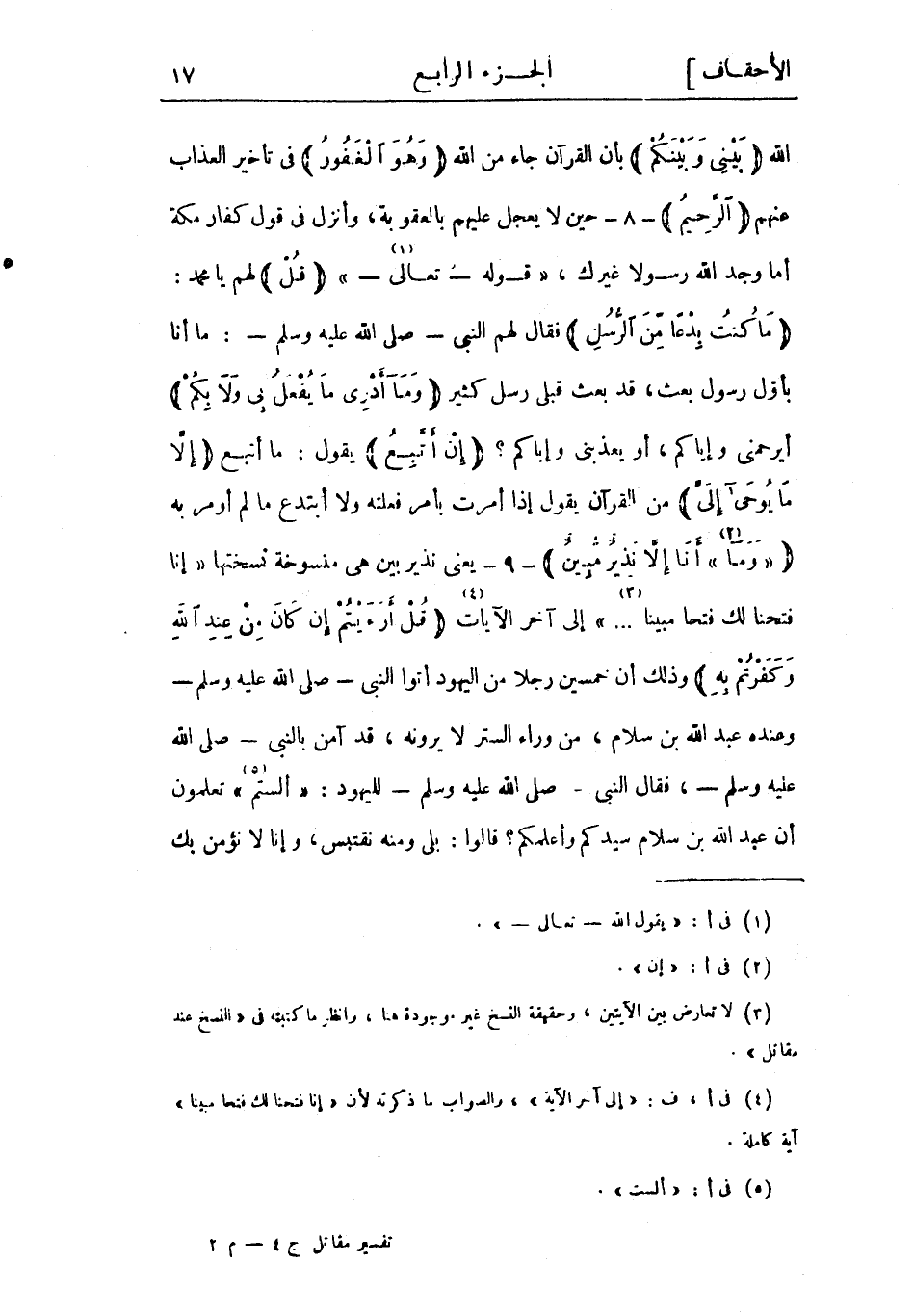 وَما أَدْرِي مَا يُفْعَلُ بِي وَلا بِكُمْ أيرحمني وإياكم، أو يعذبني وإياكم؟ إِنْ أَتَّبِعُ يقول: ما أتبع إِلَّا مَا يُوحى إِلَيَّ من القرآن يقول إذا أمرت بأمر فعلته ولا أبتدع ما لم أومر به «وَما» «2» أَنَا إِلَّا نَذِيرٌ مُبِينٌ- 9- يعني نذير بين هي منسوخة نسختها إِنَّا فَتَحْنا لَكَ فَتْحاً مُبِيناً ... «3» إلى آخر الآيات «4» قُلْ أَرَأَيْتُمْ إِنْ كانَ مِنْ عِنْدِ اللَّهِ وَكَفَرْتُمْ بِهِ وذلك