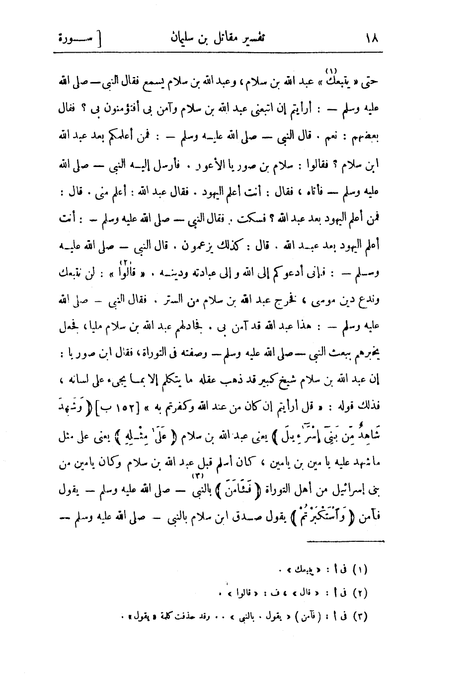 حتى «يتبعك» «1» عبد الله بن سلام، وعبد الله بن سلام يسمع فقال النبي- صلى الله عليه وسلم-: أرأيتم إن اتبعني عبد الله بن سلام وآمن بي أفتؤمنون بي؟ فقال بعضهم: نعم. قال النبي- صلى الله عليه وسلم-: فمن أعلمكم بعد عبد الله ابن سلام؟ فقالوا: سلام بن صوريا الأعور. فأرسل إليه النبي- صلى الله عليه وسلم- فأتاه، فقال: أنت أعلم اليهود. فقال عبد الله: أعلم مني. قال: