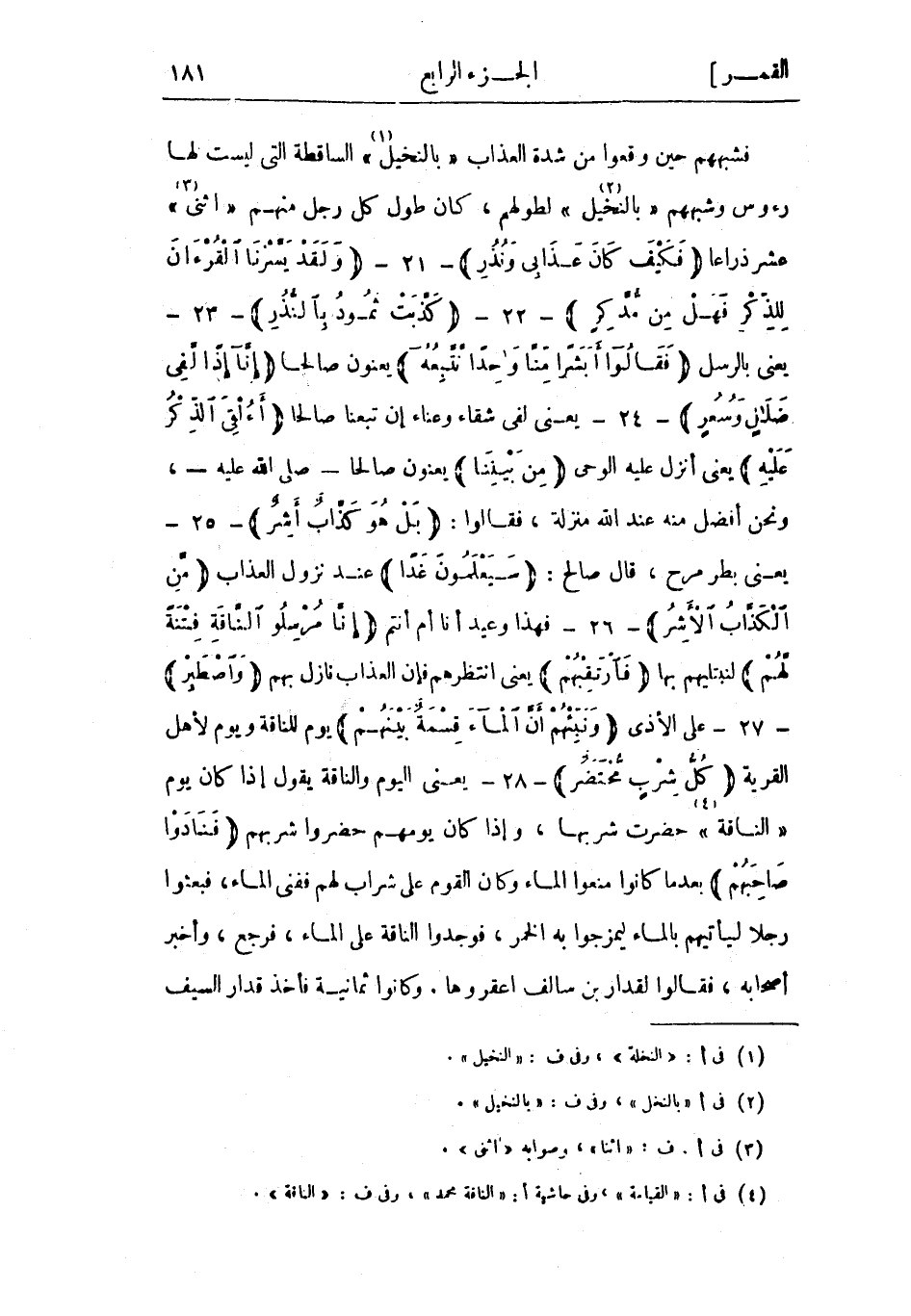 فشبههم حين وقعوا من شدة العذاب «بالنخيل «1» » الساقطة التي ليست لها رءوس وشبههم «بالنخيل «2» » لطولهم، كان طول كُلّ رَجُل منهم «اثنى «3» » عشر ذراعا فَكَيْفَ كانَ عَذابِي وَنُذُرِ- 21- وَلَقَدْ يَسَّرْنَا الْقُرْآنَ لِلذِّكْرِ فَهَلْ مِنْ مُدَّكِرٍ- 22- كَذَّبَتْ ثَمُودُ بِالنُّذُرِ- 23- يعني بالرسل فَقالُوا أَبَشَراً مِنَّا واحِداً نَتَّبِعُهُ يعنون صالحا إِنَّا إِذاً لَفِي ضَلالٍ وَسُعُرٍ- 24- يعني لفي شقاء وعناء إن تبعنا صالحا أَأُلْقِيَ الذِّكْرُ عَلَيْهِ يعني أنزل عليه الوحي مِنْ بَيْنِنا يعنون صالحا- صلى الله عليه-، ونحن أفضل منه عند الله منزلة، فقالوا: بَلْ هُوَ كَذَّابٌ أَشِرٌ- 25- يعني بطر مرح، قال صالح: سَيَعْلَمُونَ غَداً عند نزول العذاب مَنِ الْكَذَّابُ الْأَشِرُ- 26- فهذا وعيد أنا أم أنتم إِنَّا مُرْسِلُوا النَّاقَةِ فِتْنَةً لَهُمْ لنبتليهم بها فَارْتَقِبْهُمْ يعني انتظرهم فإن العذاب نازل بهم وَاصْطَبِرْ- 27- على الأذى وَنَبِّئْهُمْ أَنَّ الْماءَ قِسْمَةٌ بَيْنَهُمْ يوم للناقة ويوم لأهل القرية كُلُّ شِرْبٍ مُحْتَضَرٌ- 28- يعني اليوم والناقة يقول إذا كان يوم «الناقة» «4» حضرت شربها، وإذا كان يومهم حضروا شربهم فَنادَوْا صاحِبَهُمْ بعد ما كانوا منعوا الماء وكان القوم على شراب لهم ففني الماء، فبعثوا رجلا ليأتيهم بالماء ليمزجوا به الخمر، فوجدوا الناقة على الماء، فرجع، وأخبر أصحابه، فقالوا لقدار بن سالف اعقروها. وكانوا ثمانية فأخذ قدار السيف