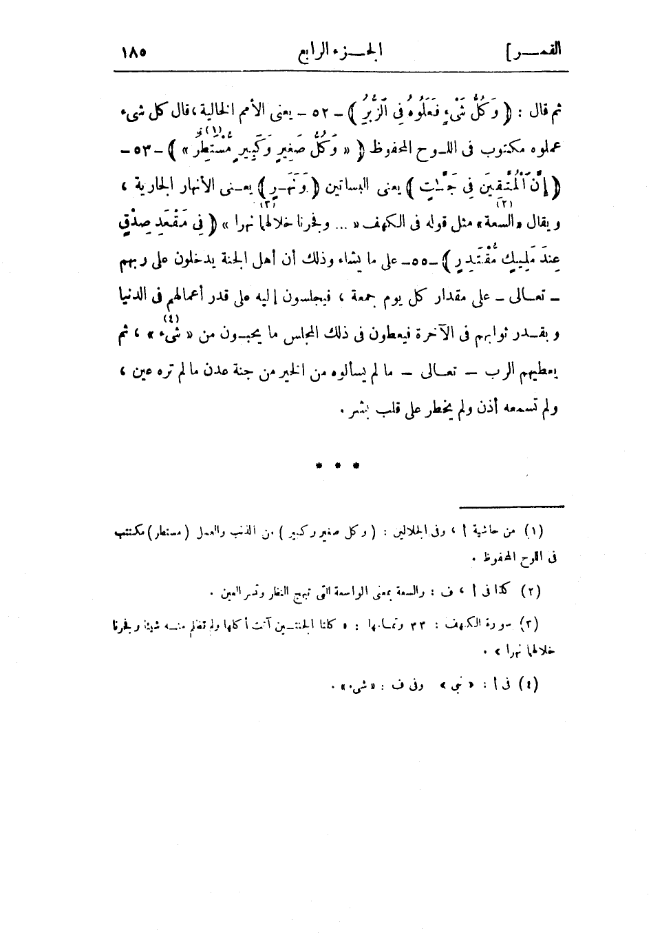 ثم قال: وَكُلُّ شَيْءٍ فَعَلُوهُ فِي الزُّبُرِ- 52- يعني الأمم الخالية، قال كل شيء عملوه مكتوب في اللوح المحفوظ «وَكُلُّ صَغِيرٍ وَكَبِيرٍ مُسْتَطَرٌ» «1» - 53- إِنَّ الْمُتَّقِينَ فِي جَنَّاتٍ يعني البساتين وَنَهَرٍ يعني الأنهار الجارية، ويقال «السعة» «2» مثل قوله في الكهف « ... وَفَجَّرْنا خِلالَهُما «3» نَهَراً» فِي مَقْعَدِ صِدْقٍ عِنْدَ مَلِيكٍ مُقْتَدِرٍ- 55- على ما يشاء وذلك أن أهل الجنة يدخلون على ربهم- تعالى- على مقدار كل يوم جمعة، فيجلسون إليه على قدر أعمالهم في الدنيا وبقدر ثوابهم في الآخرة فيعطون في ذلك المجلس ما يحبون من «شيء» «4» ، ثم يعطيهم الرب- تعالى- ما لم يسألوه من الخير من جنة عدن ما لم تره عين، ولم تسمعه أذن ولم يخطر على قلب بشر.