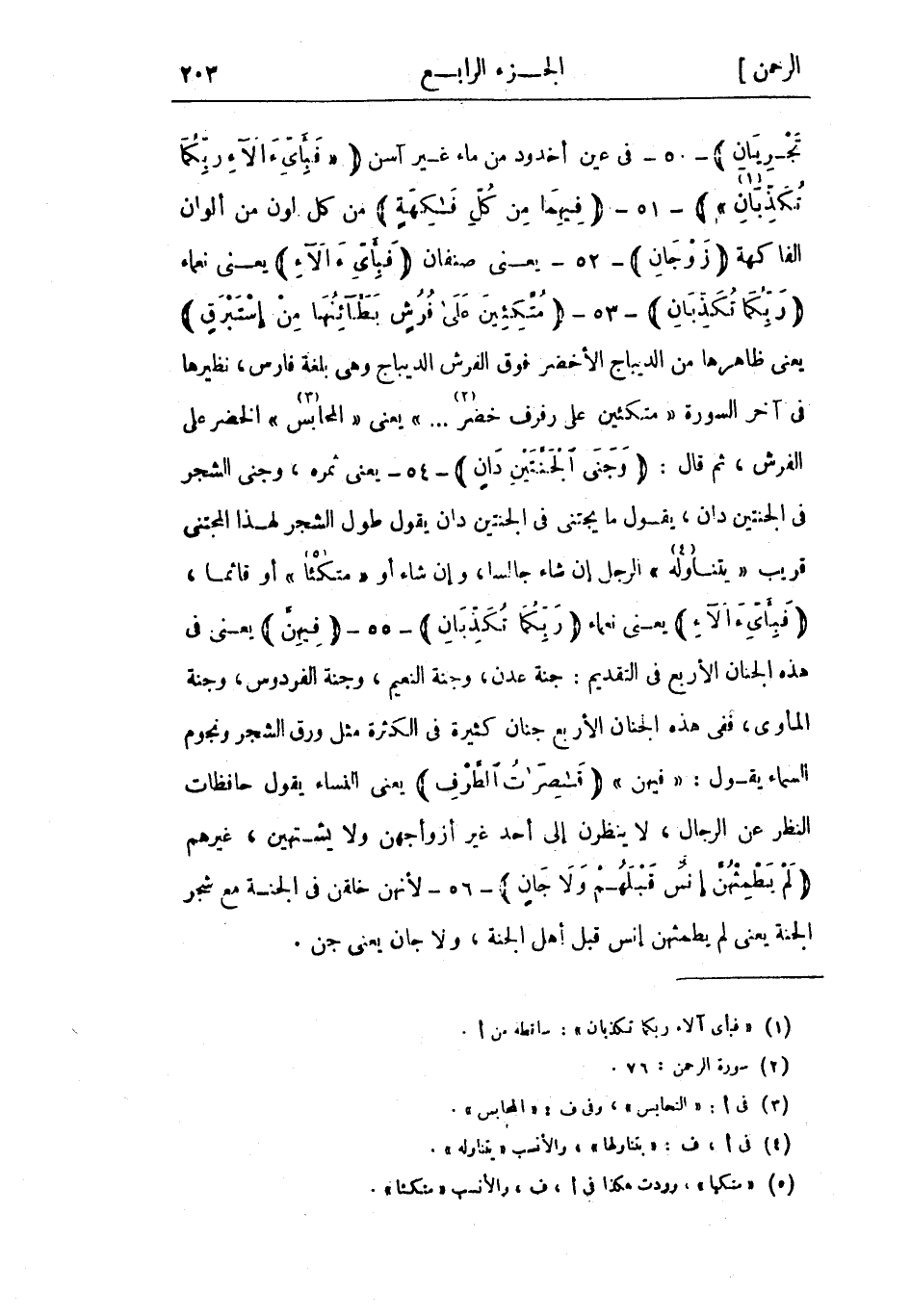 - 50- في عين أخدود من ماء غير آسن «فَبِأَيِّ آلاءِ رَبِّكُما تُكَذِّبانِ» «1» - 51- فِيهِما مِنْ كُلِّ فاكِهَةٍ من كل لون من ألوان الفاكهة زَوْجانِ- 52- يعني صنفان فَبِأَيِّ آلاءِ يعني نعماء رَبِّكُما تُكَذِّبانِ- 53- مُتَّكِئِينَ عَلى فُرُشٍ بَطائِنُها مِنْ إِسْتَبْرَقٍ يعني ظاهرها من الديباج الأخضر فوق الفرش الديباج وهي بلغة فارس، نظيرها في آخر السورة «مُتَّكِئِينَ عَلى رَفْرَفٍ خُضْرٍ «2» ... » يعني «المحابس «3» » الخضر على الفرش، ثم قال: وَجَنَى الْجَنَّتَيْنِ دانٍ- 54- يعني ثمره، وجنى الشجر في الجنتين دان، يقول ما يجتني في الجنتين دان يقول طول الشجر لهذا المجتنى قريب «يتناوله «4» » الرجل إن شاء جالسا، وإن شاء أو «متكئا «5» » أو قائما، فَبِأَيِّ آلاءِ يعني نعماء رَبِّكُما تُكَذِّبانِ- 55- فِيهِنَّ يعني في هذه الجنان الأربع في التقديم: جنة عدن، وجنة النعيم، وجنة الفردوس، وجنة المأوى، ففي هذه الجنان الأربع جنان كثيرة في الكثرة مثل ورق الشجر ونجوم السماء يقول: «فيهن» قاصِراتُ الطَّرْفِ يعني النساء يقول حافظات النظر عن الرجال، لا ينظرن إلى أحد غير أزواجهن ولا يشتهين، غيرهم لَمْ يَطْمِثْهُنَّ إِنْسٌ قَبْلَهُمْ وَلا جَانٌّ- 56- لأنهن خلقن في الجنة مع شجر الجنة يعني لم يطمثهن إنس قبل أهل الجنة، ولا جان يعنى جن.