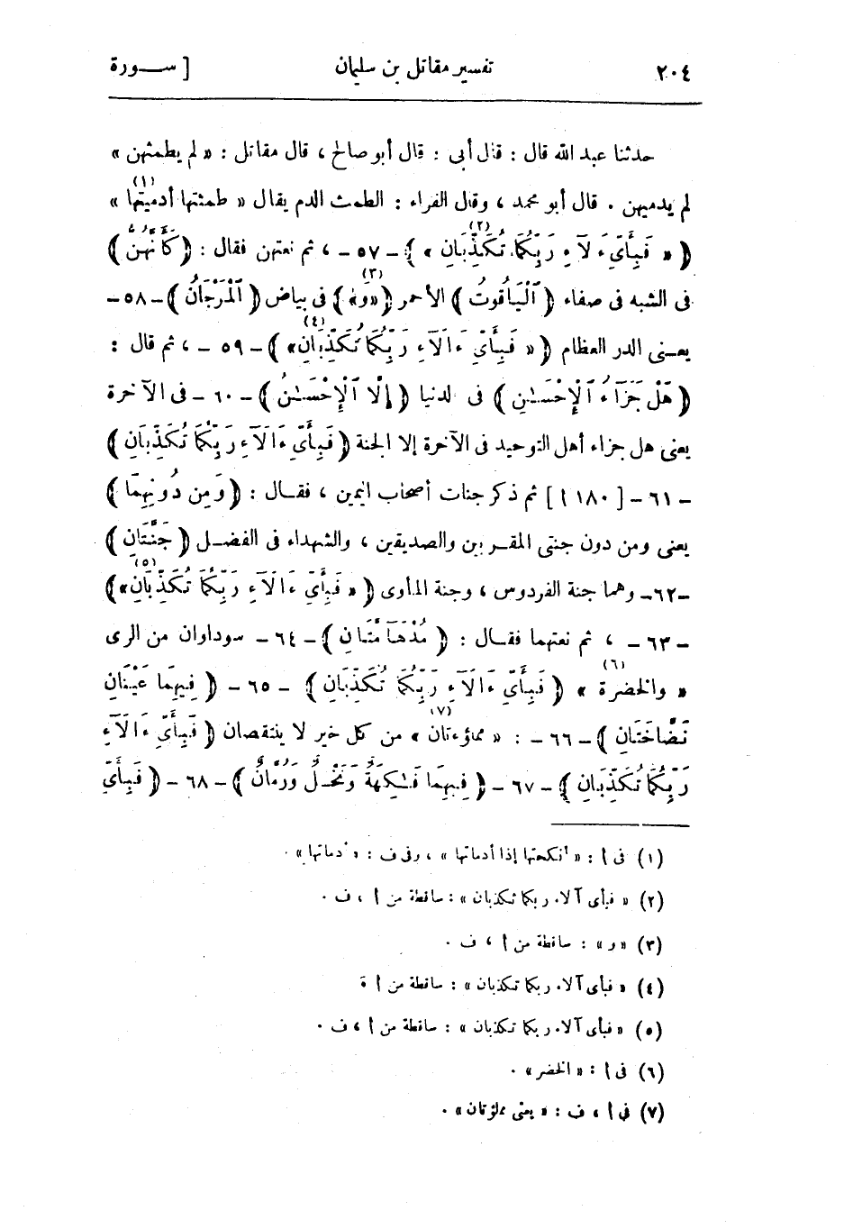 هَلْ جَزاءُ الْإِحْسانِ فى لدنيا إِلَّا الْإِحْسانُ- 60- فى الآخرة يعنى هل جزاء أهل التوحيد فى الآخرة إلا الجنة فَبِأَيِّ آلاءِ رَبِّكُما تُكَذِّبانِ- 61-[180 أ] ثم ذكر جنات أصحاب اليمين، فقال: وَمِنْ دُونِهِما يعني ومن دون جنتي المقربين والصديقين، والشهداء في الفضل جَنَّتانِ- 62- وهما جنة الفردوس، وجنة المأوى «فَبِأَيِّ آلاءِ رَبِّكُما تُكَذِّبانِ» «5» - 63-، ثم نعتهما فقال: مُدْهامَّتانِ- 64- سوداوان من الري «والخضرة «6» » فَبِأَيِّ آلاءِ رَبِّكُما تُكَذِّبانِ- 65-يهِما عَيْنانِ نَضَّاخَتانِ
